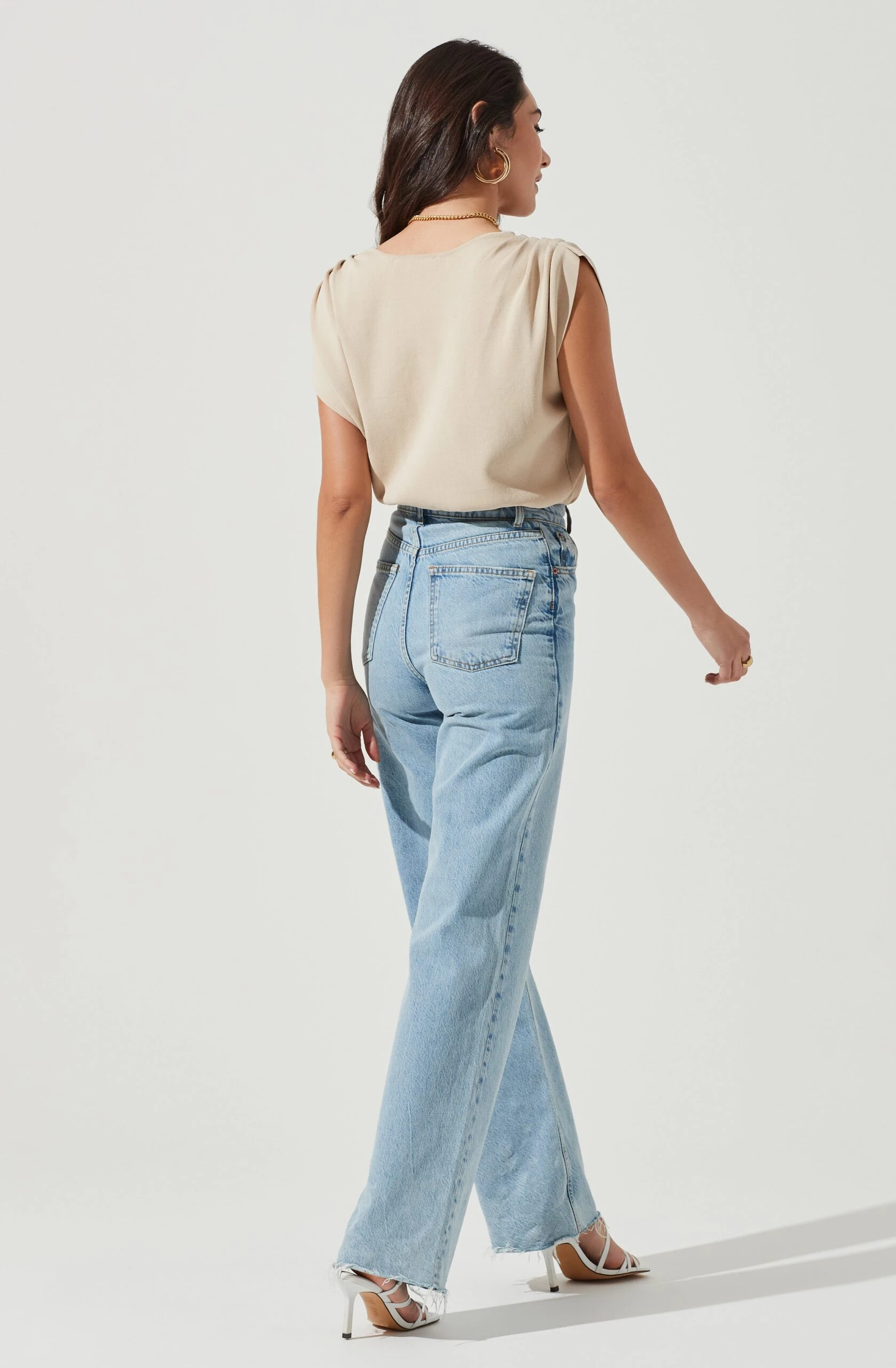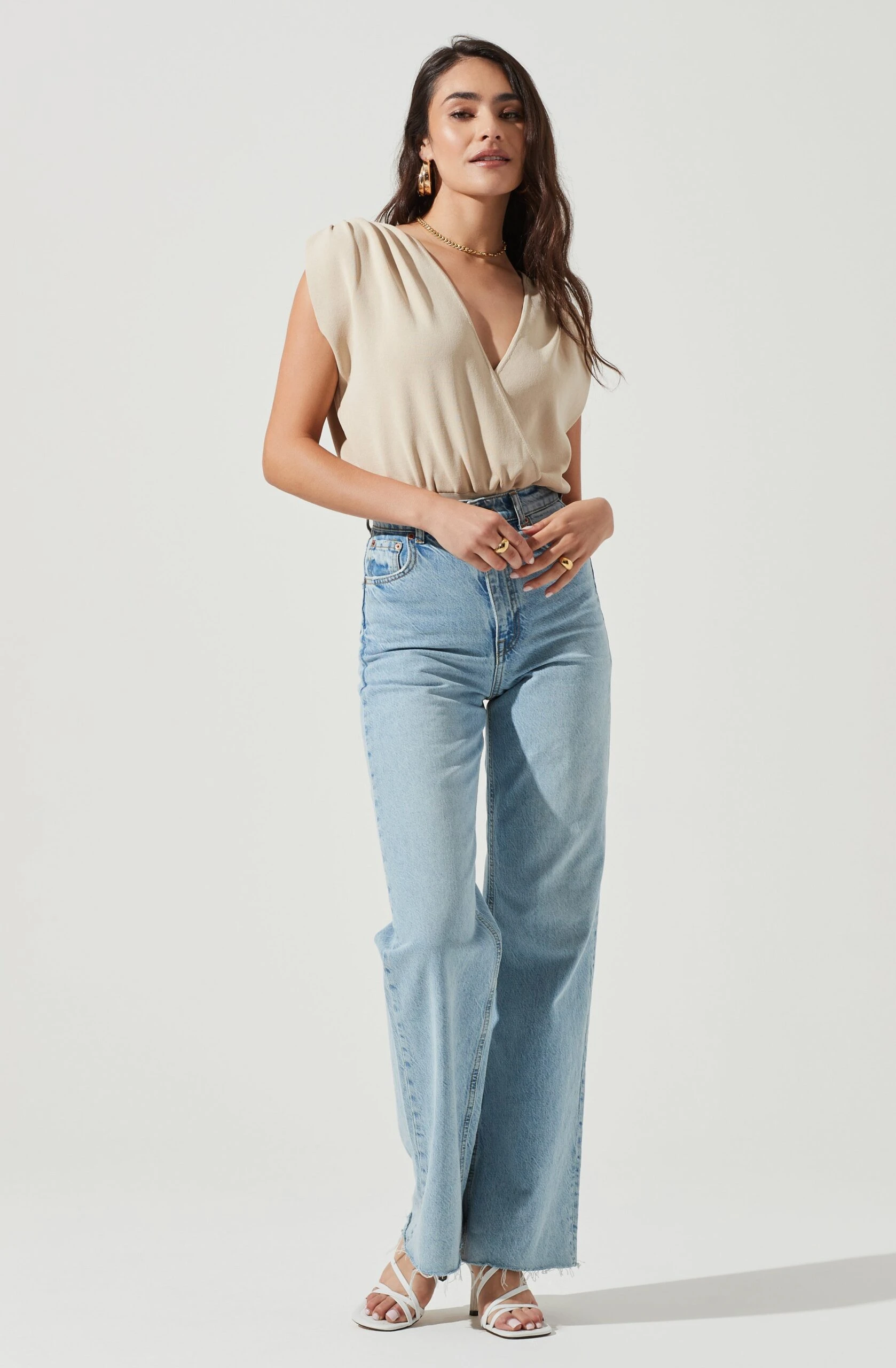The Aldrin bodysuit features a plunging neckline that leads to a surplice front. Gathered shoulders. Sleeveless design. Attached bottoms have snap button closures.