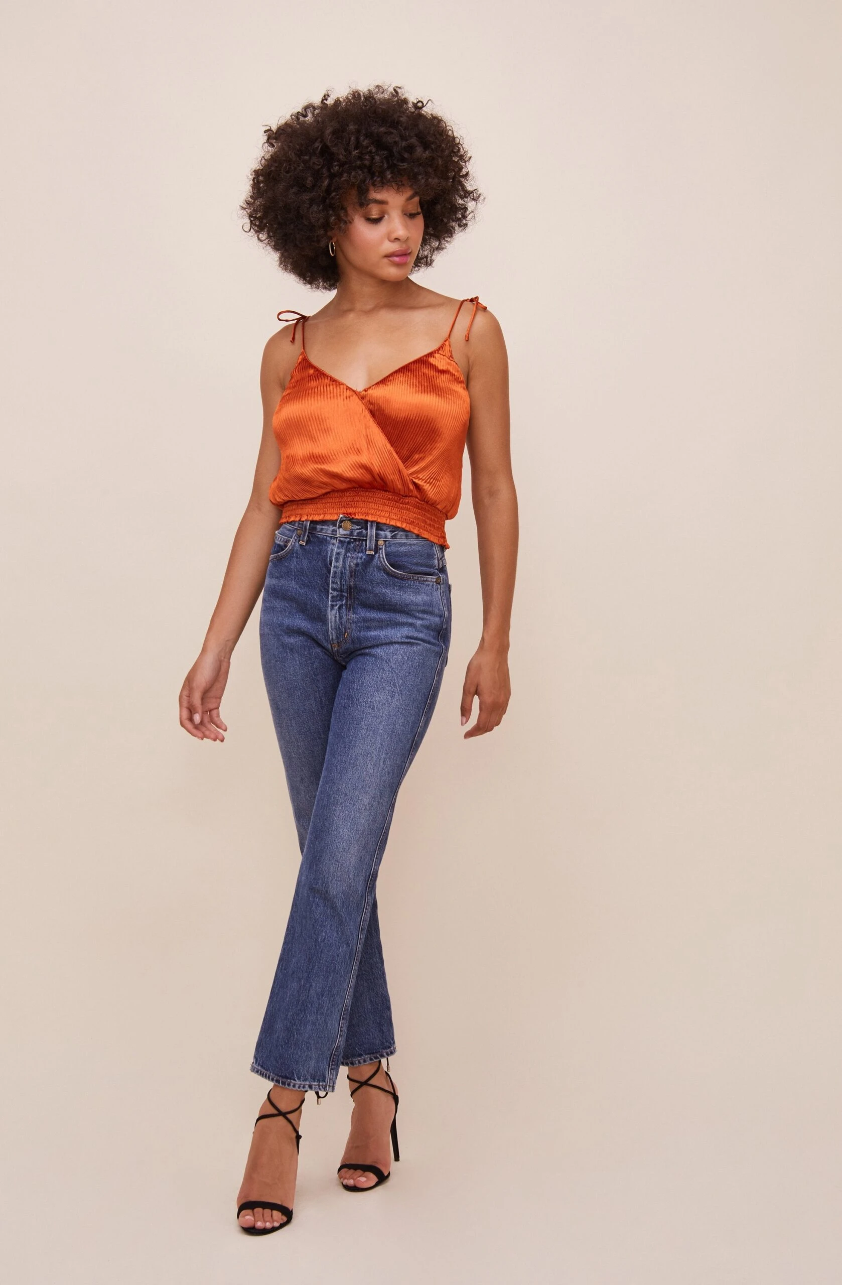 Luxe detailing for fall takes center stage. This dressy crop top features a perfectly pleated fabrication for ultimate outfit interest. Sexy V neckline is supported by delicate self-tie shoulder straps. Wrap front leads to a smocked waist. Low cut back.