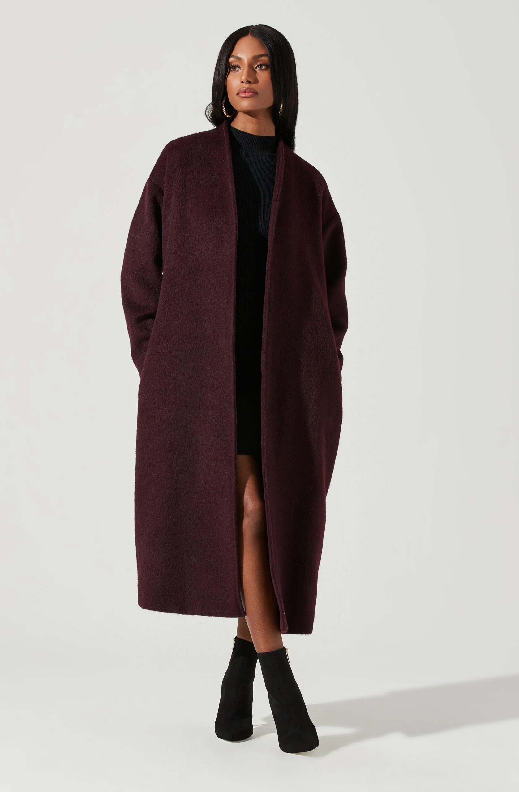 The Berkley Coat features a wool blend finish. Open front features a tying sash at the waist. Long sleeves. Side pockets.