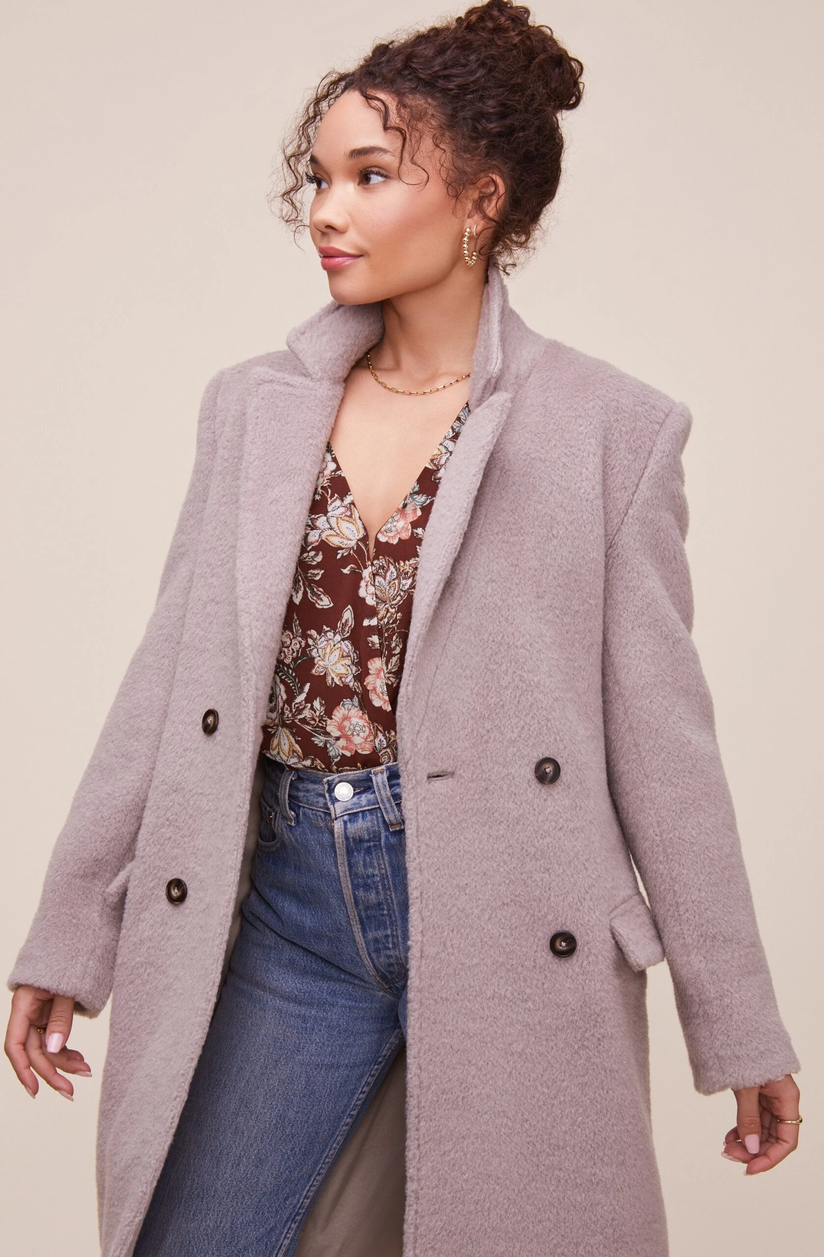 Sleek and sophisticated, the Blair coat accentuates your outfit while keeping you warm! It features a notched lapel that descends to a double breasted front. Flap pockets on the side. Long sleeves. Vented hem.