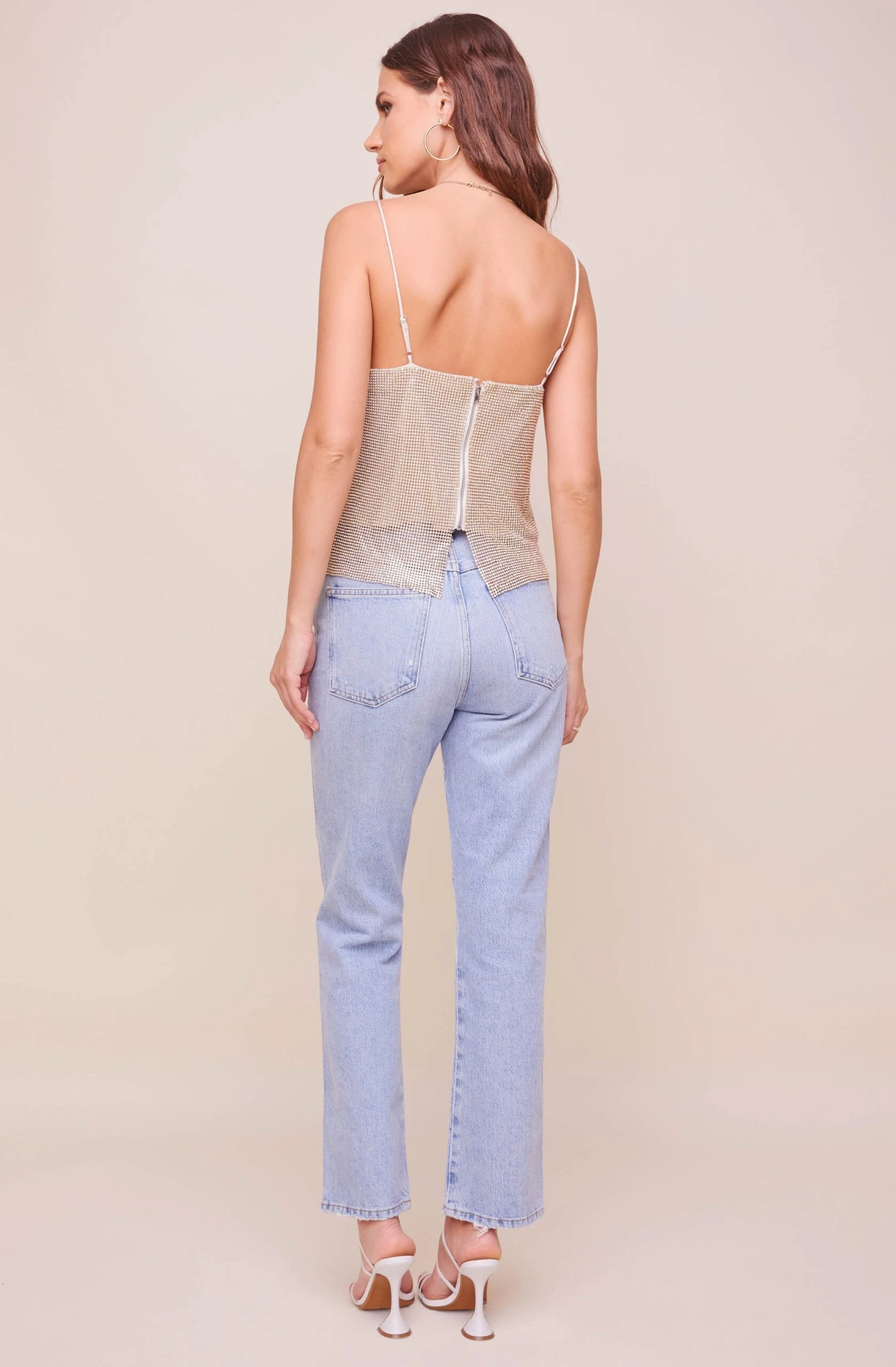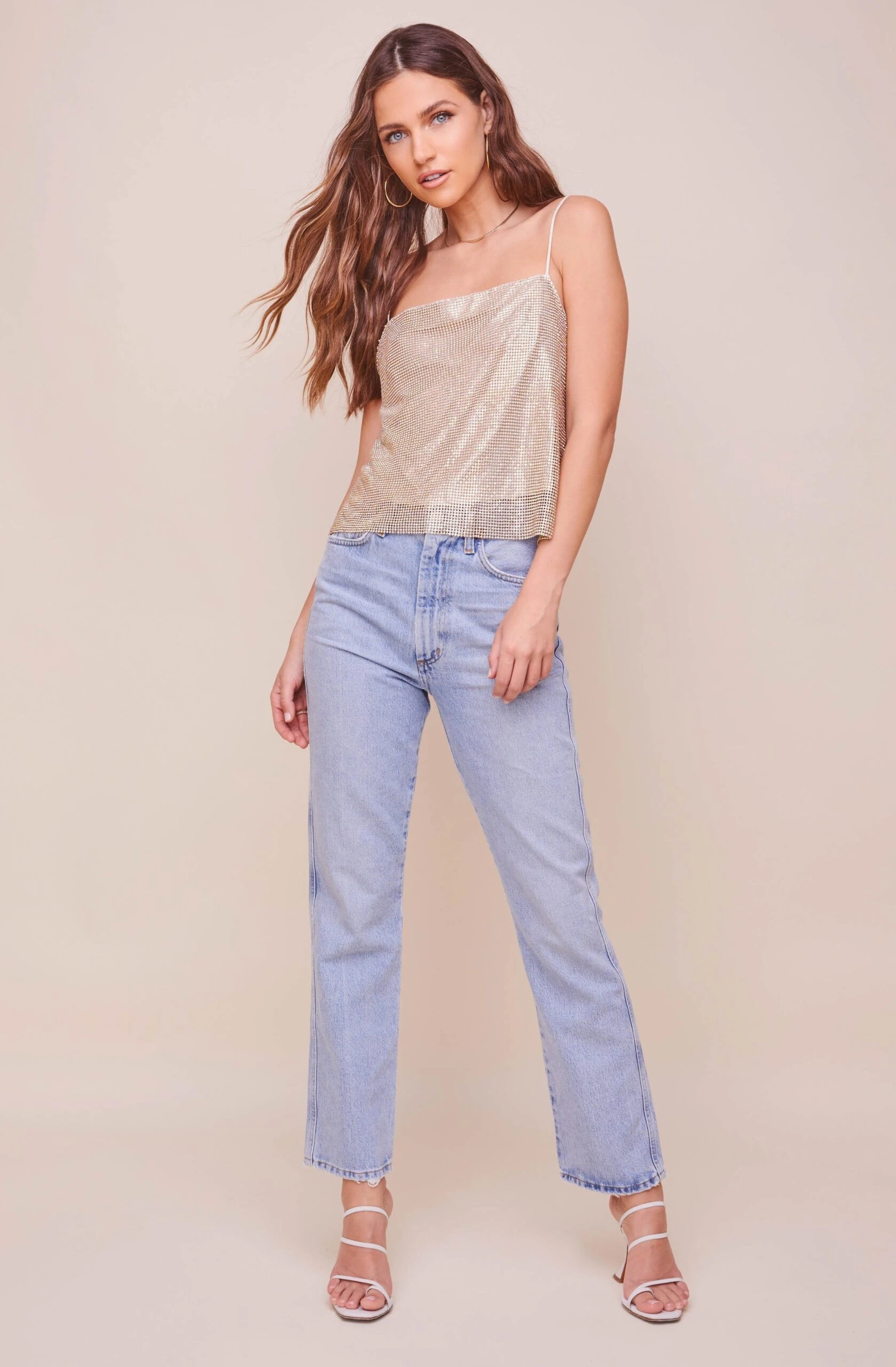 We’ve got disco fever, babe! Stand out in the cami that’s got everybody talking! It features a metallic chain-mail-style construction with a cowl neck and fully lined design. Notched hemline. Barely-there straps.