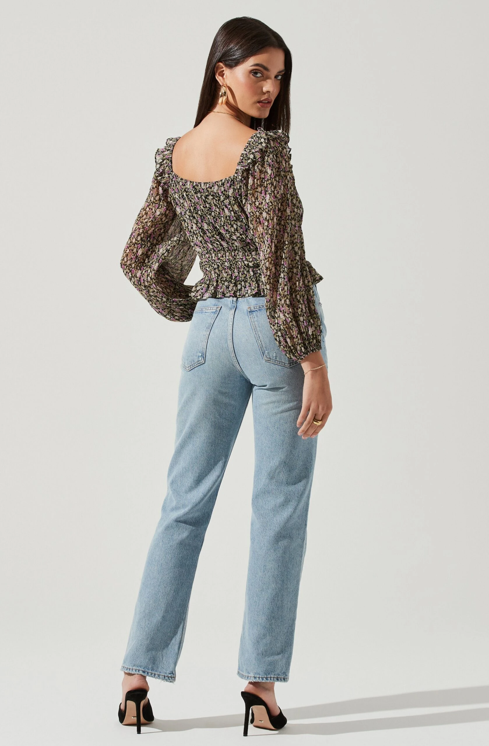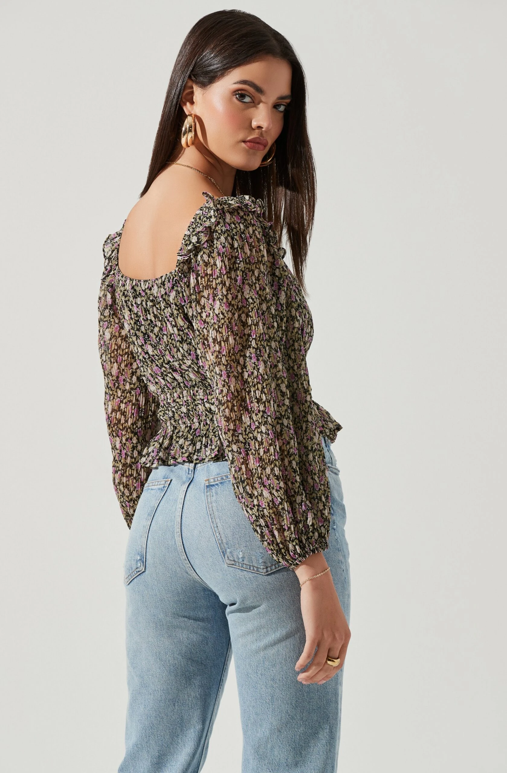 Spring florals make their way to the Elva top. It features a square neckline with ruffle trim detailing along the shoulders. Smocked waist features a peplum hem. Long, semi-sheer puff sleeves. Square cut back.