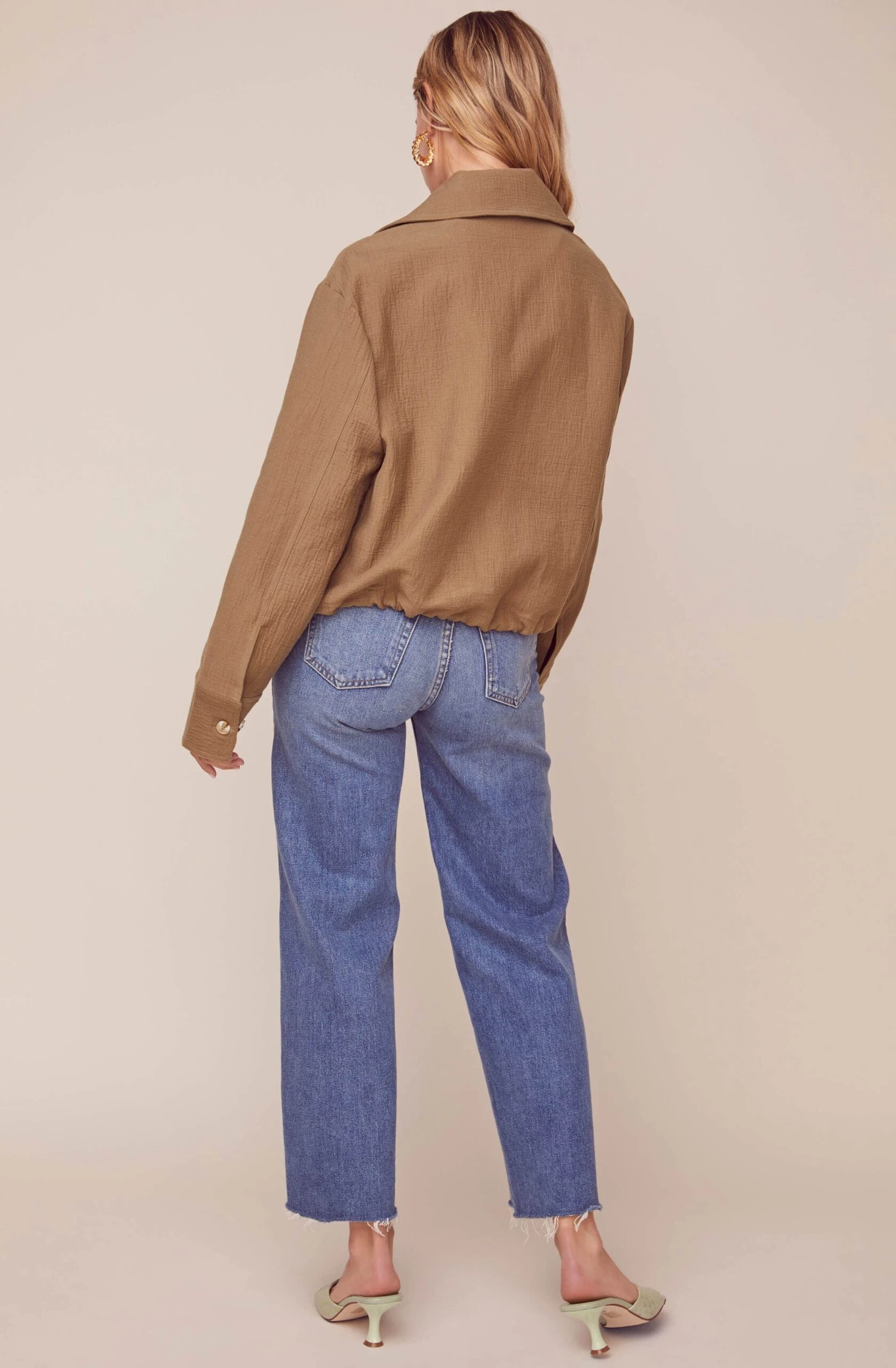 Hit the road in style! The En Route jacket features a notched lapel, mock horn button front and drawstring hemline. Patch pockets on the side and long sleeves.