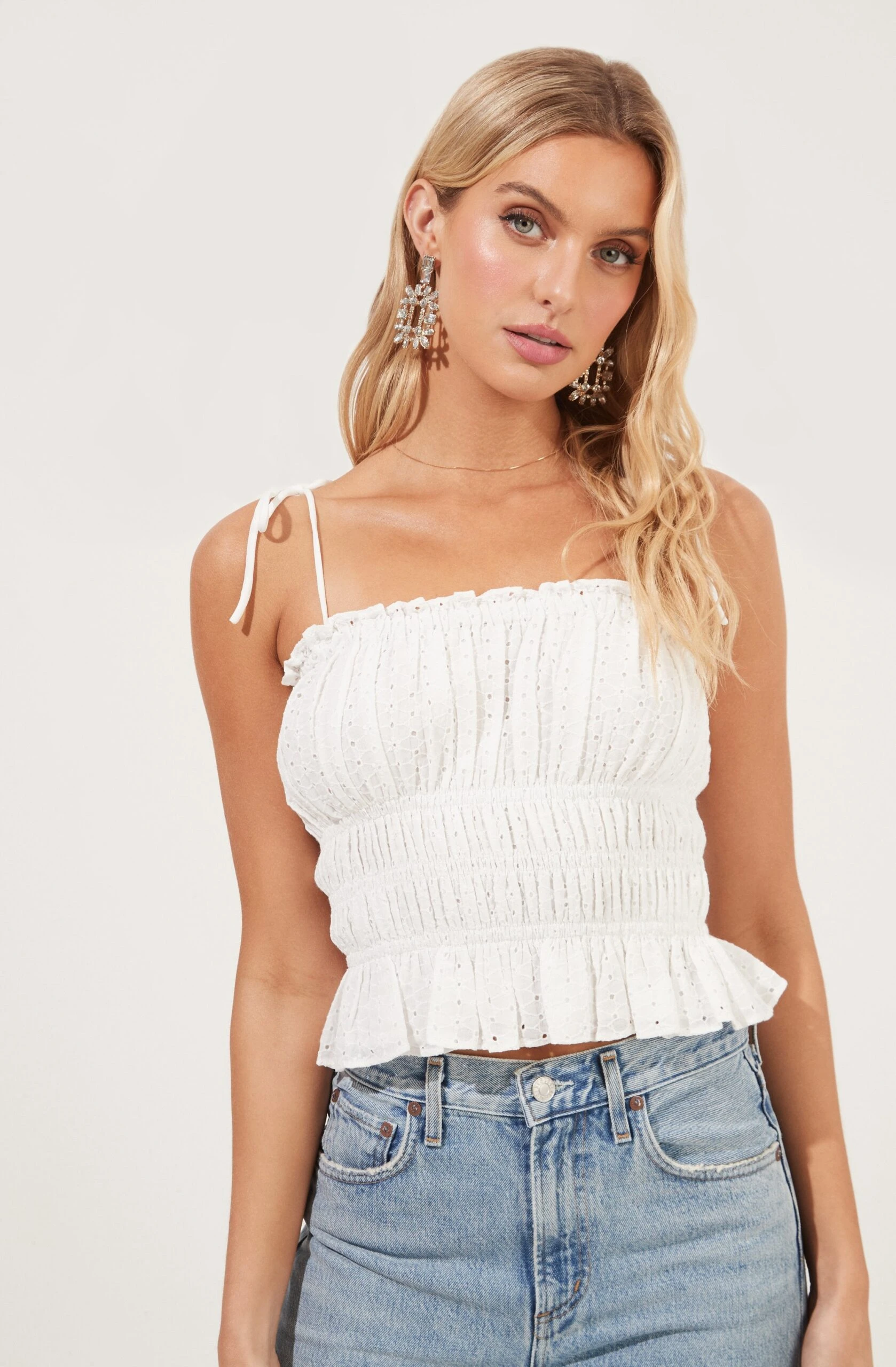This eyelet cami features a square neckline with a ruffle trim. Smocked waist and ruffle hem. Tying shoulder straps.