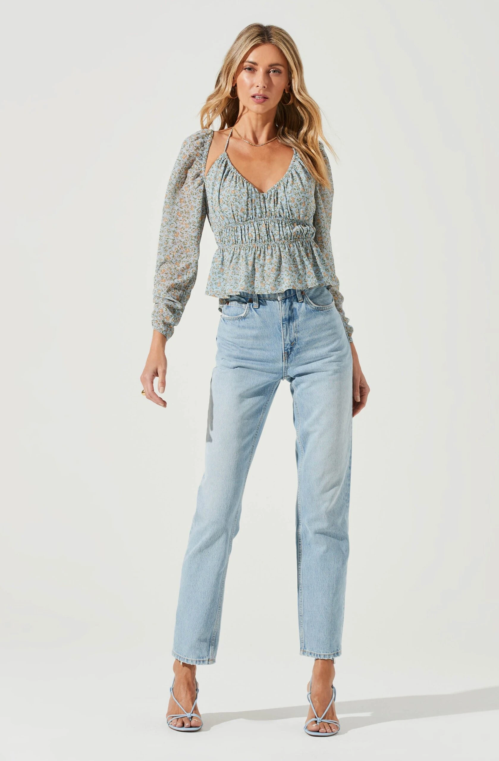 This floral top features a halter tie neck detail that leads to a cinched waist and subtle peplum hem. Long ruched puff sleeves.