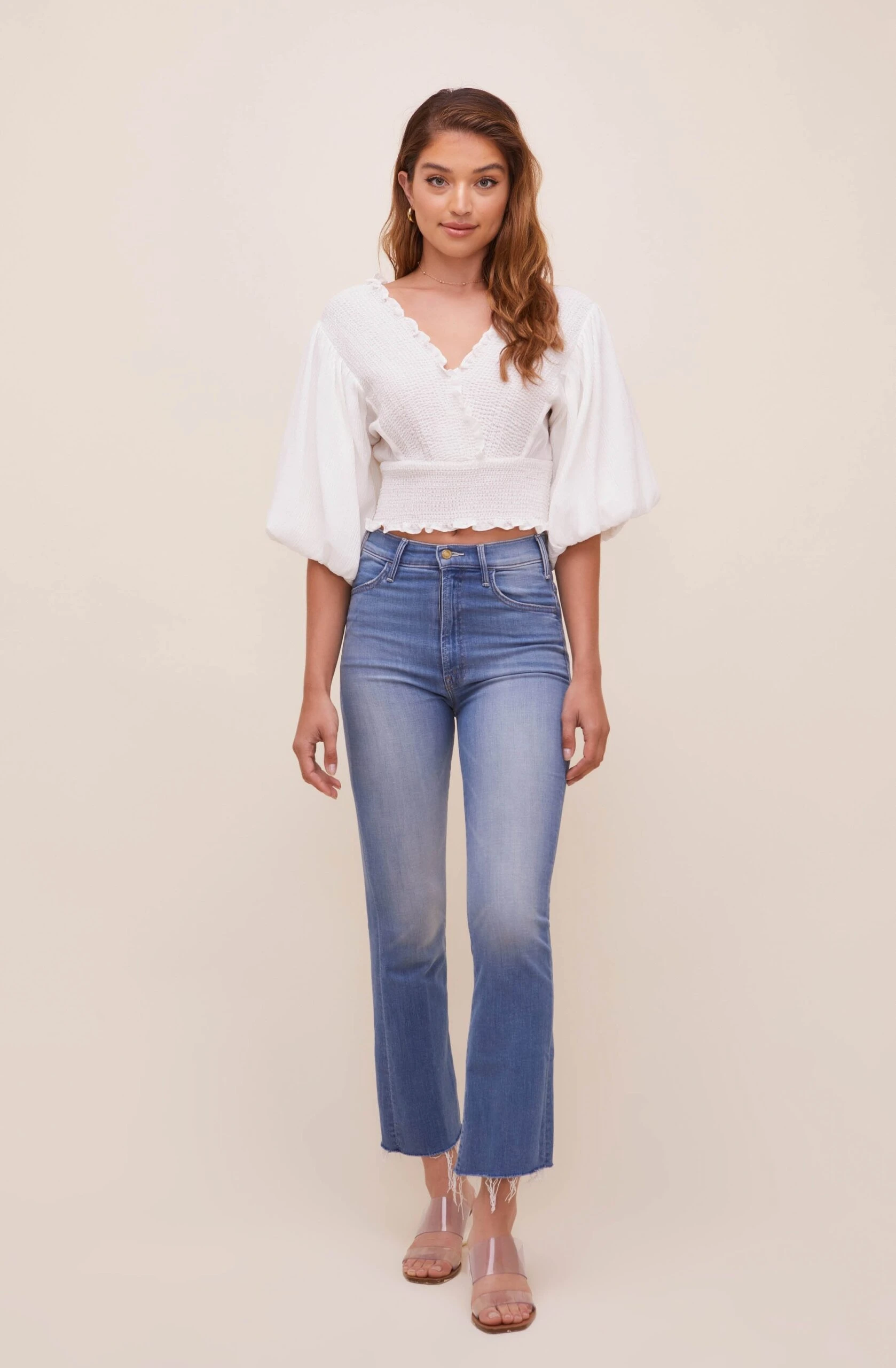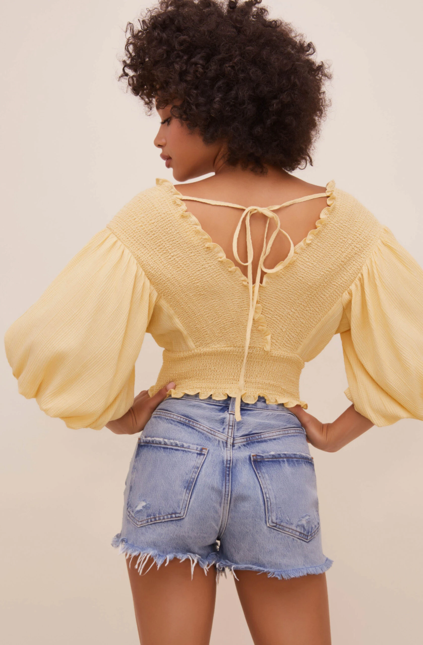 The sun is out and style comes to play. The Ginny Top features a smocked fabrication with a plunging V neckline and ruffle trim. Wrapped front leads to a defined waist with ruffle hemline. Short oversized bubble sleeves. V cut back with functional tying straps.