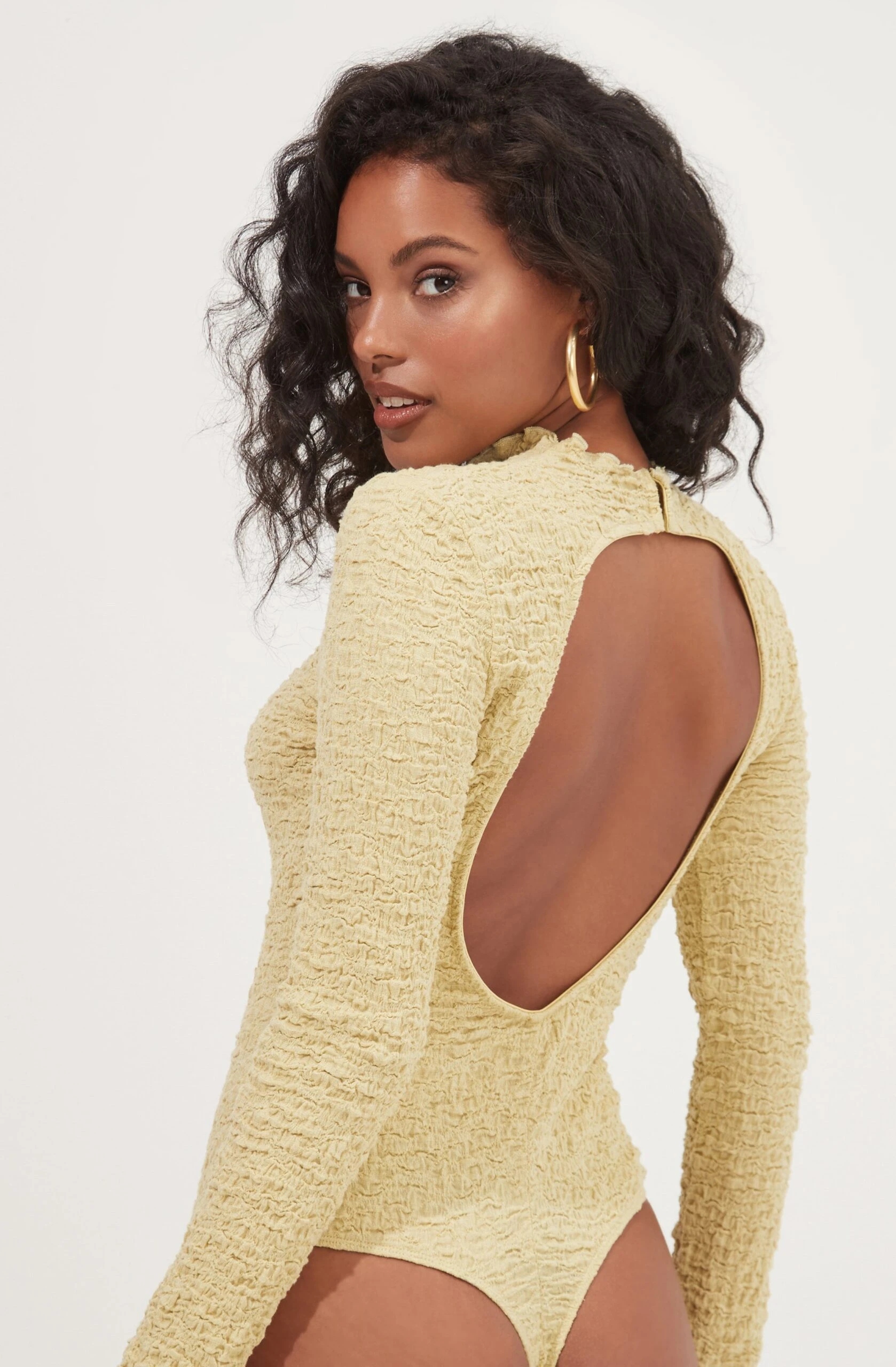 The Hawthorne Bodysuit features a crinkled fabrication with a mock neckline and fitted silhouette. Cutout open back. Long sleeves. Attached thong bottoms have snap button closures.