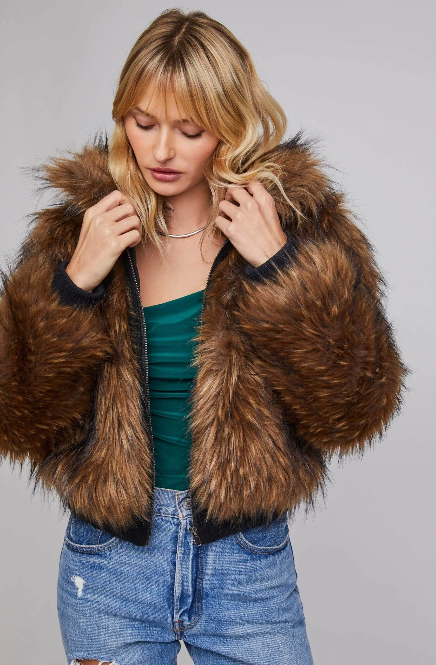 Forget all about the cold in the Jiselle Faux Fur Jacket! It features a statement pointed collar, zippered front and ribbed knit cuffs. Fully lined.