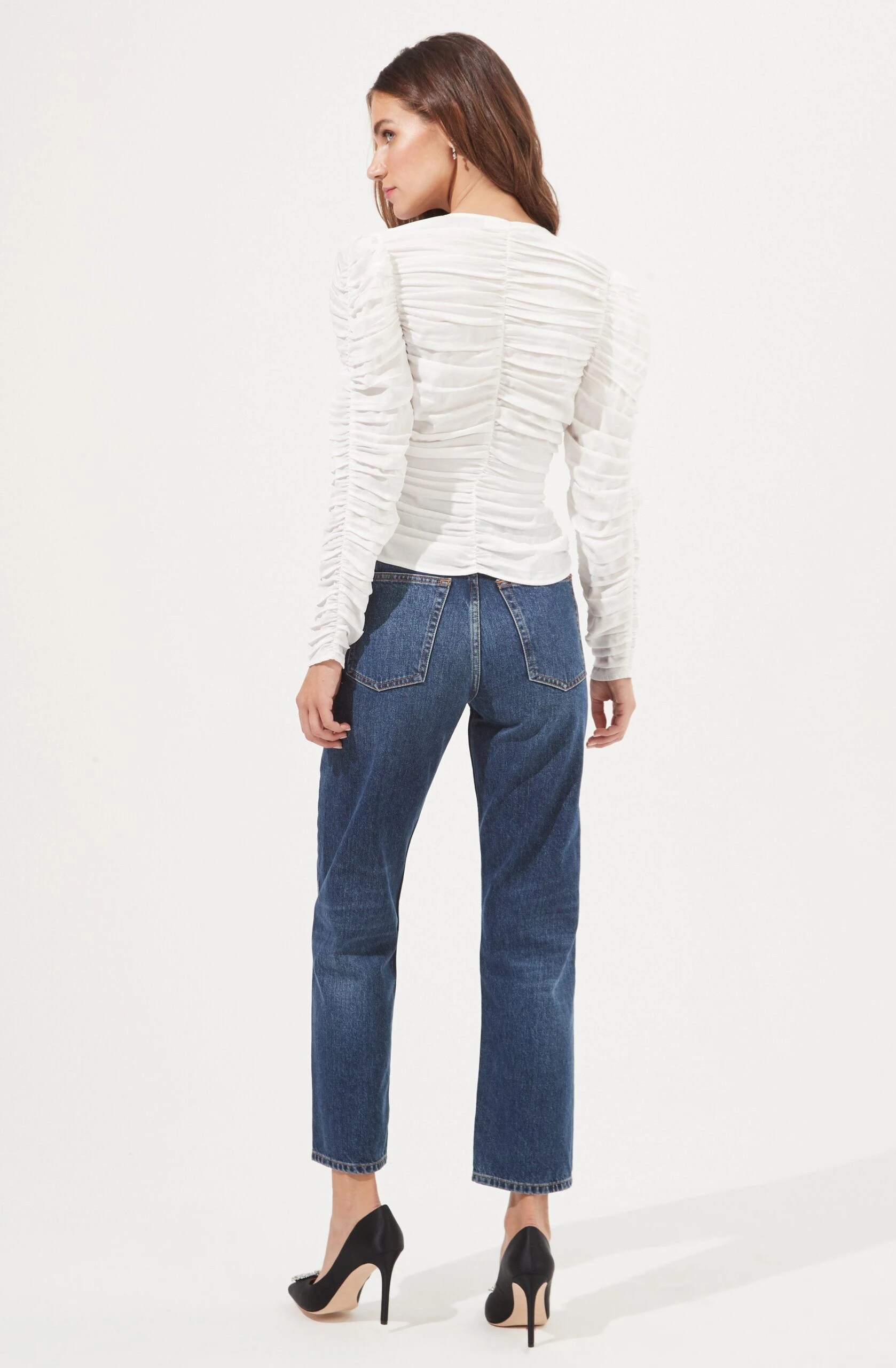 This chic satin top features a round neckline that descends to a keyhole cutout accent. Ruched bodice and long sleeves.