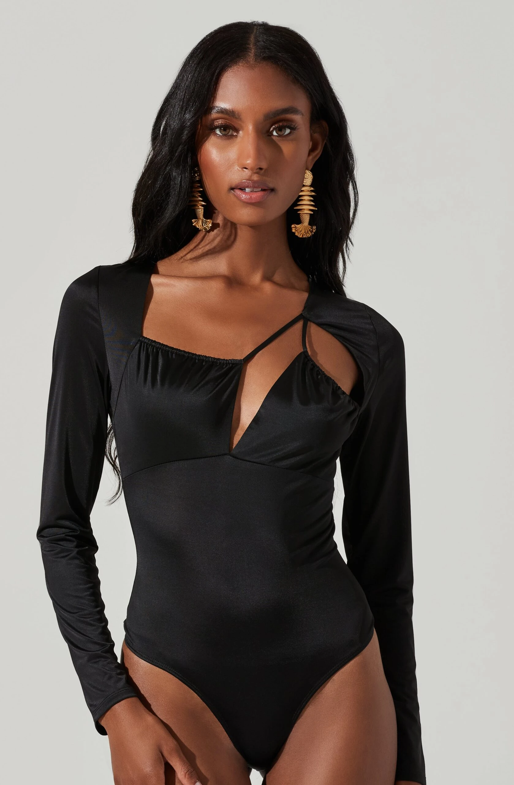 The Lauren Bodysuit features a high-shine satin construction. Asymmetrical neckline leads to a plunging bust and cutout details. Long sleeves. Attached thong bottoms have snap button closures.