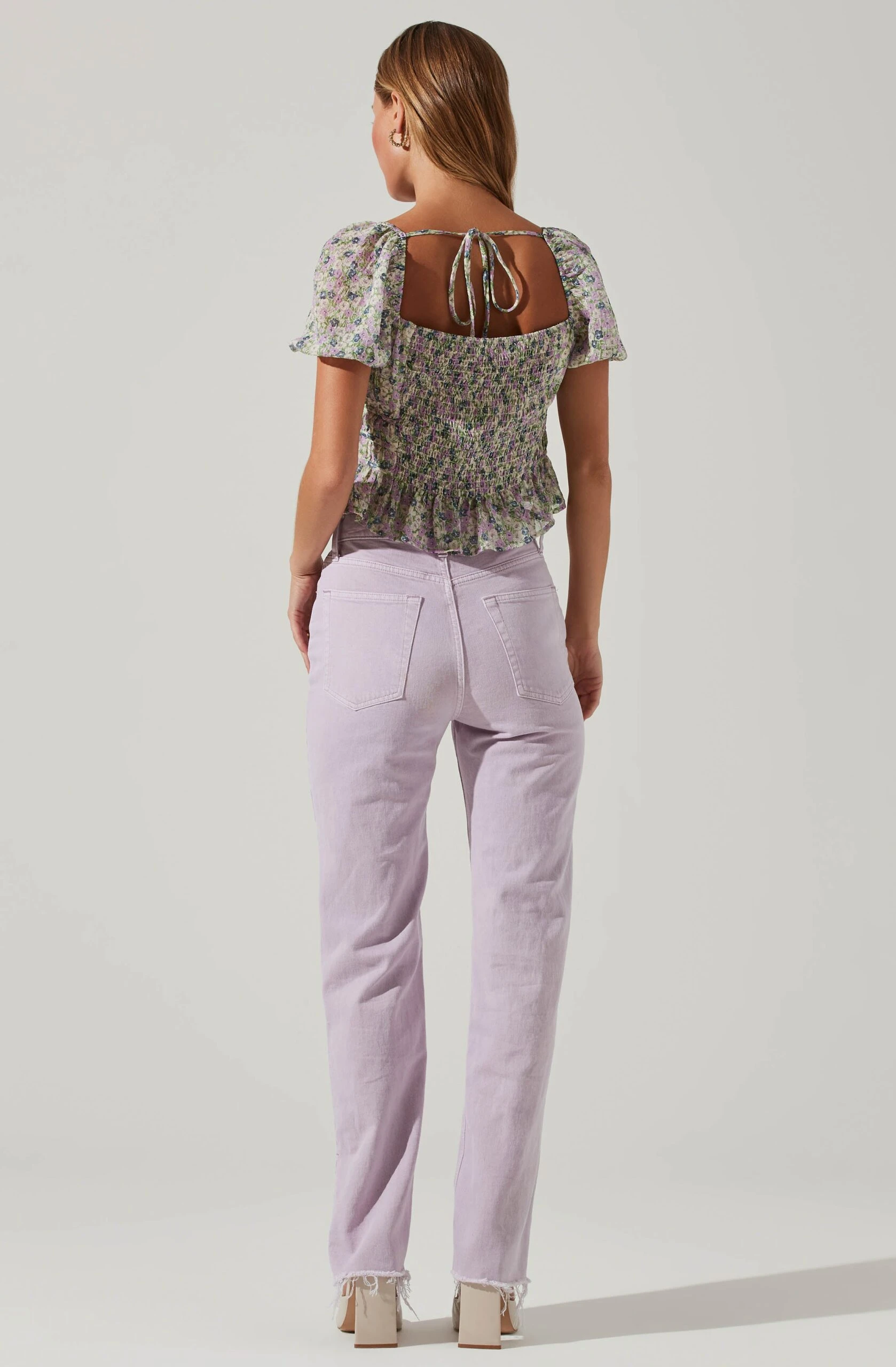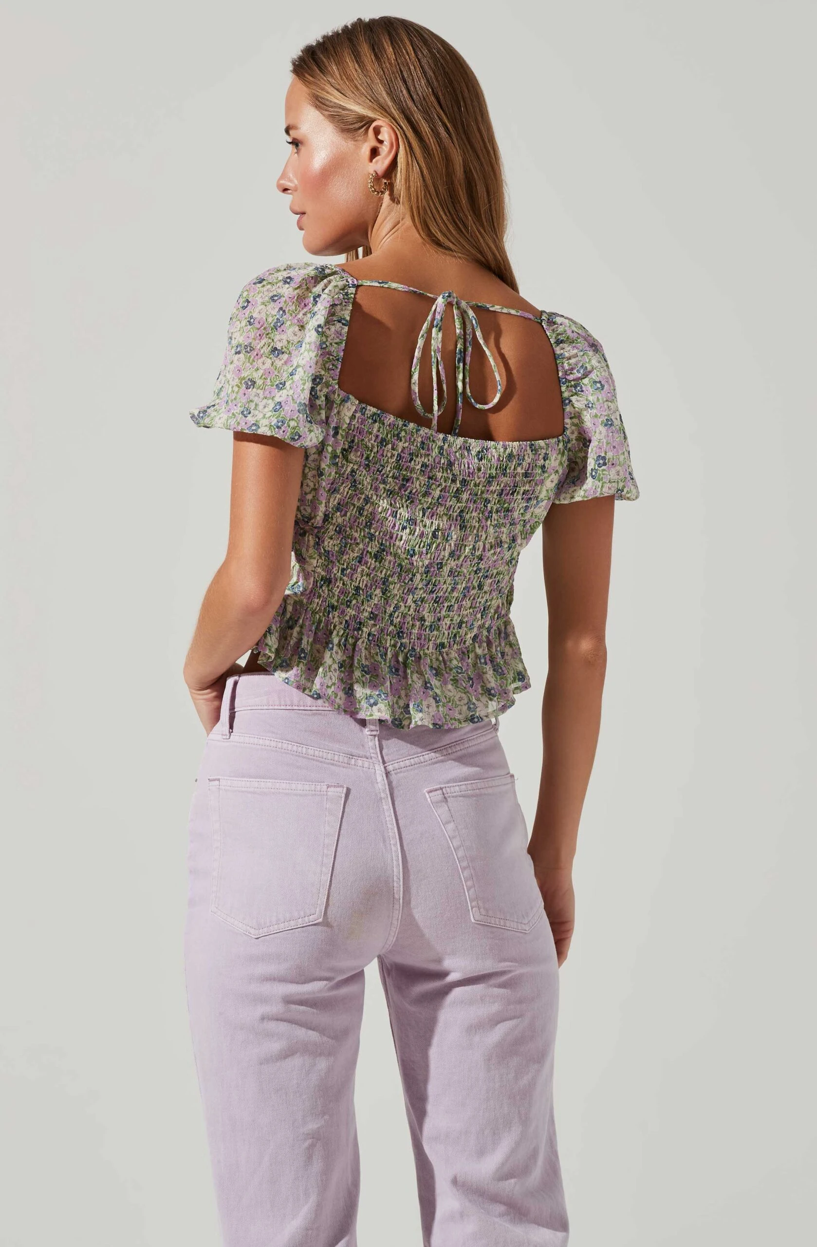The Leigh Top features a soft floral print that emanates romance. Sweetheart neckline leads to a pleated front and cinched waist. Smocked back features tying straps at the back. Short puff sleeves.