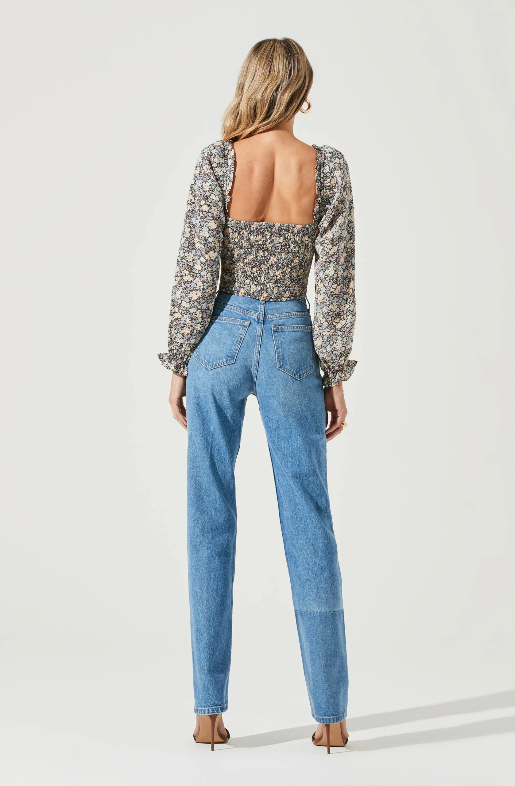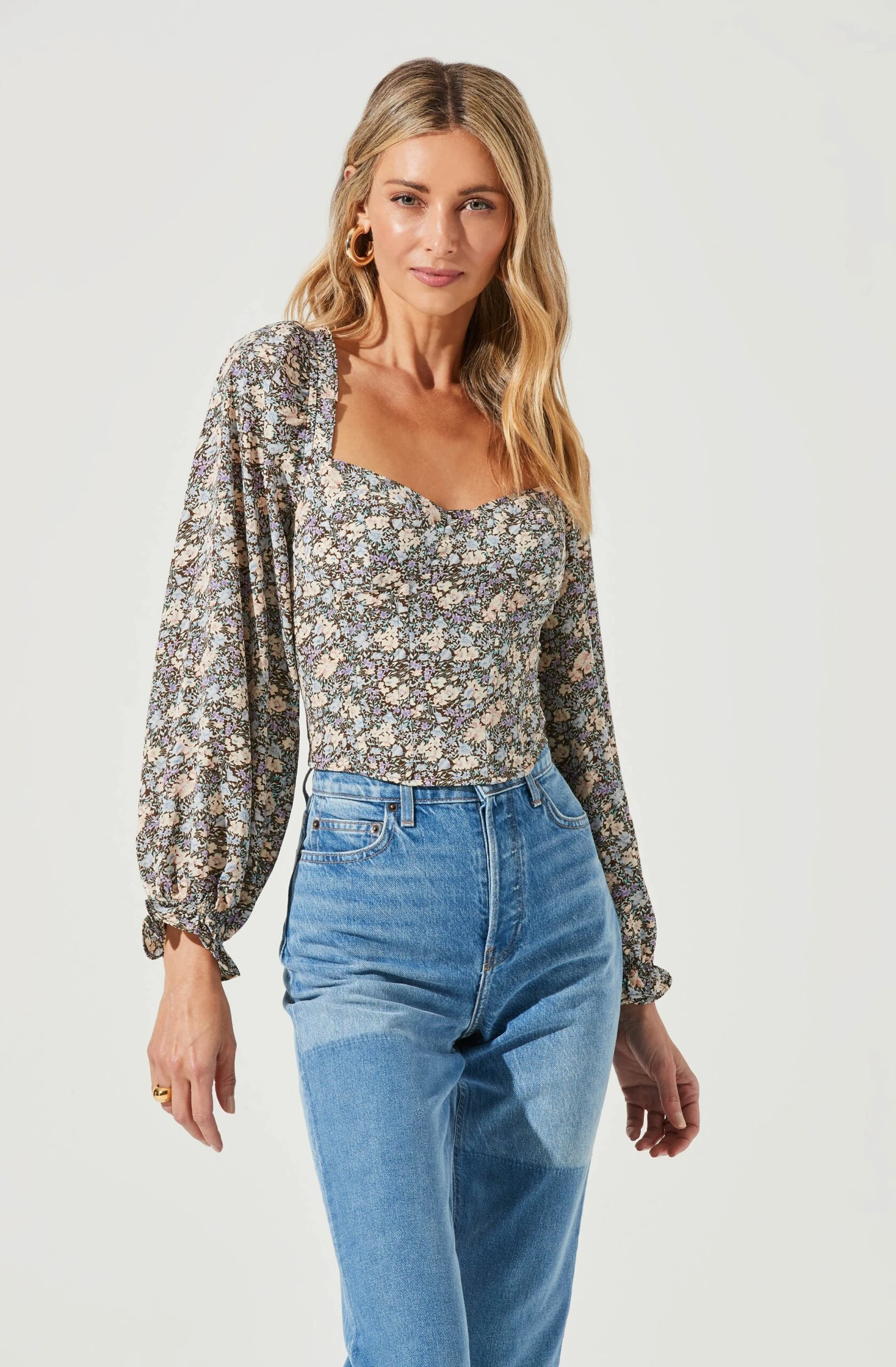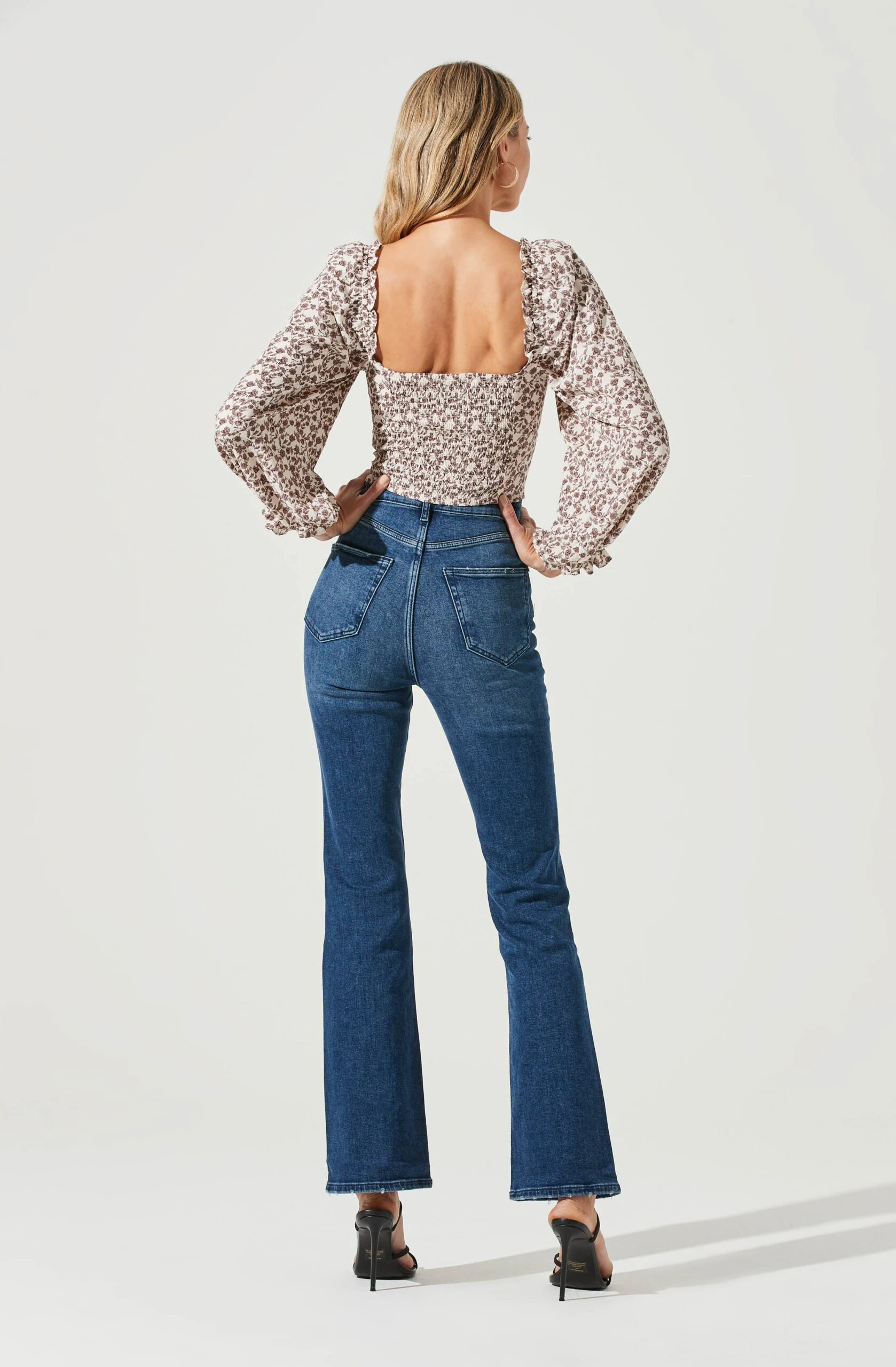 Fresh flowers decorate this chic top. It features a sweetheart neckline that leads to a darted bodice. Long sleeves with elasticized cuffs. Smocked back.