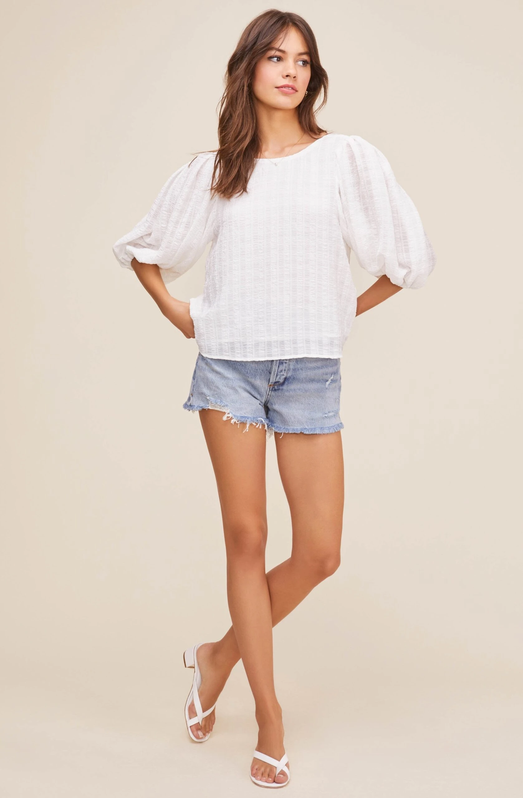 Have some fun in the Maris Top! It features a simple neckline that leads to a breezy and relaxed bodice. 3/4 puff sleeves and low cut back make this simple style stand out! Lace up detail in the back.