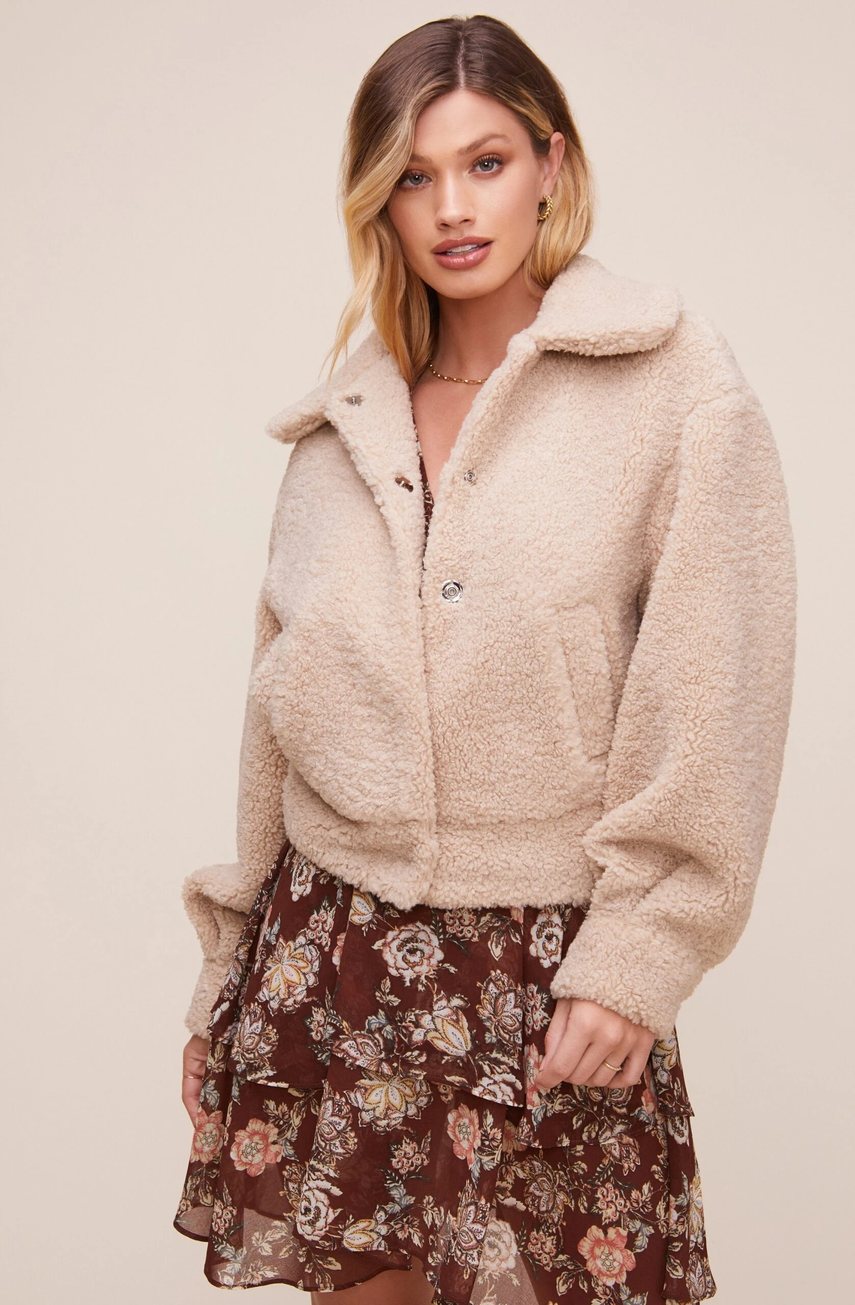 A statement jacket is all you need. The Marjorie Jacket features a an all-over shearling construction. Pointed collar descends to a buttoned front and slanted pockets at the front. Long sleeves.
