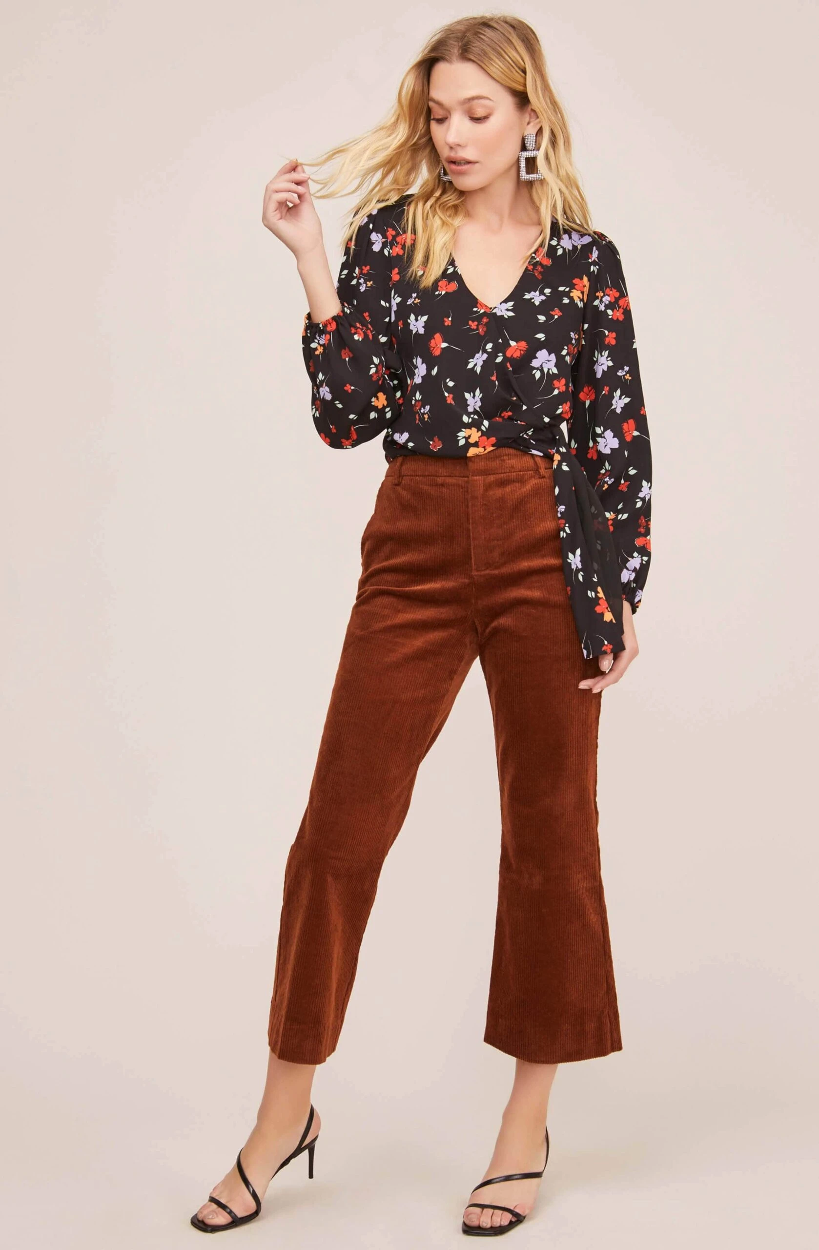 Bright florals stand out against a dark background as fashions most groundbreaking print is reinvented. This chic blouse starts with a V neckline and descends to a wrapped front with a tie waist accent. Long sleeves keep you warm all autumn long.