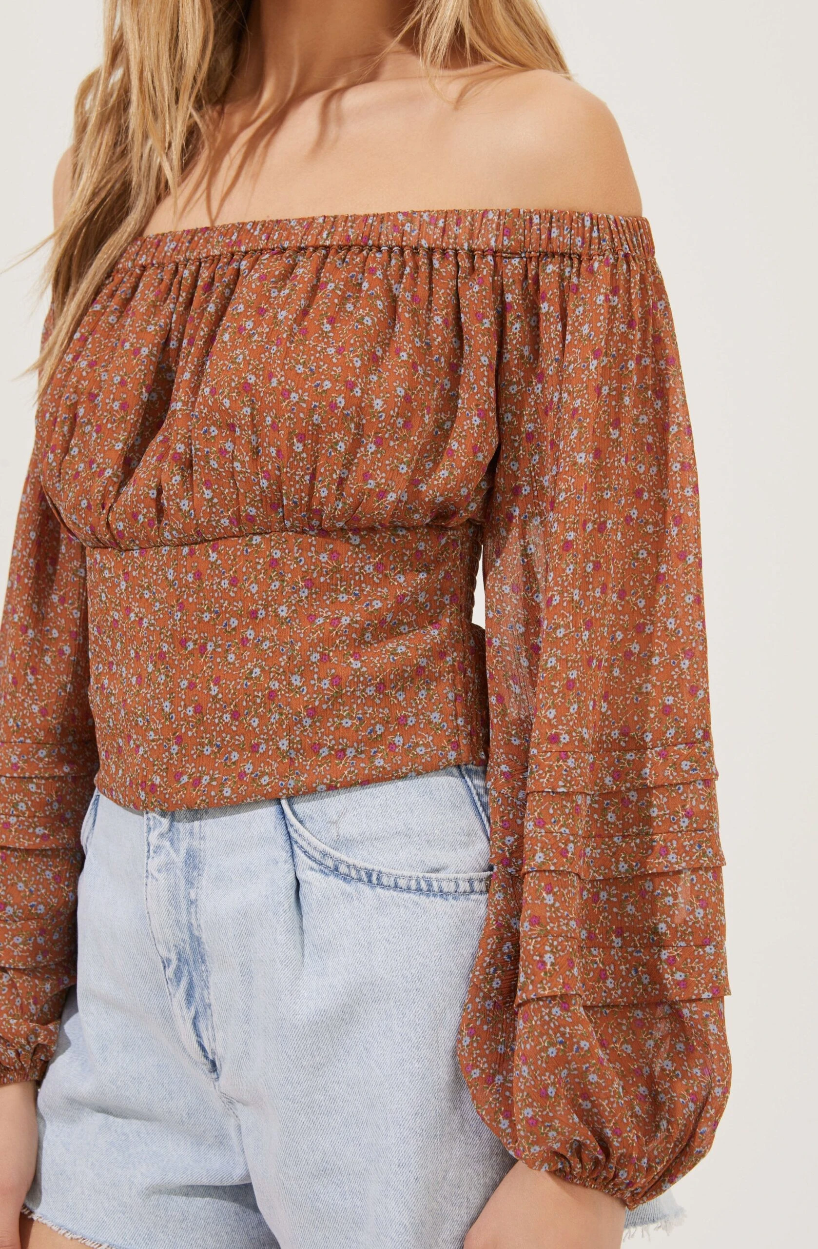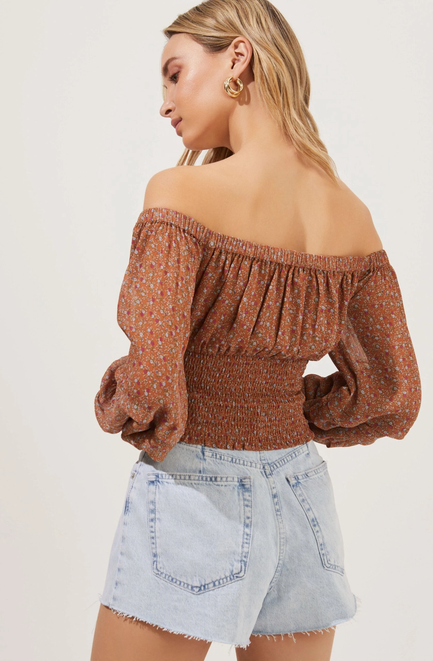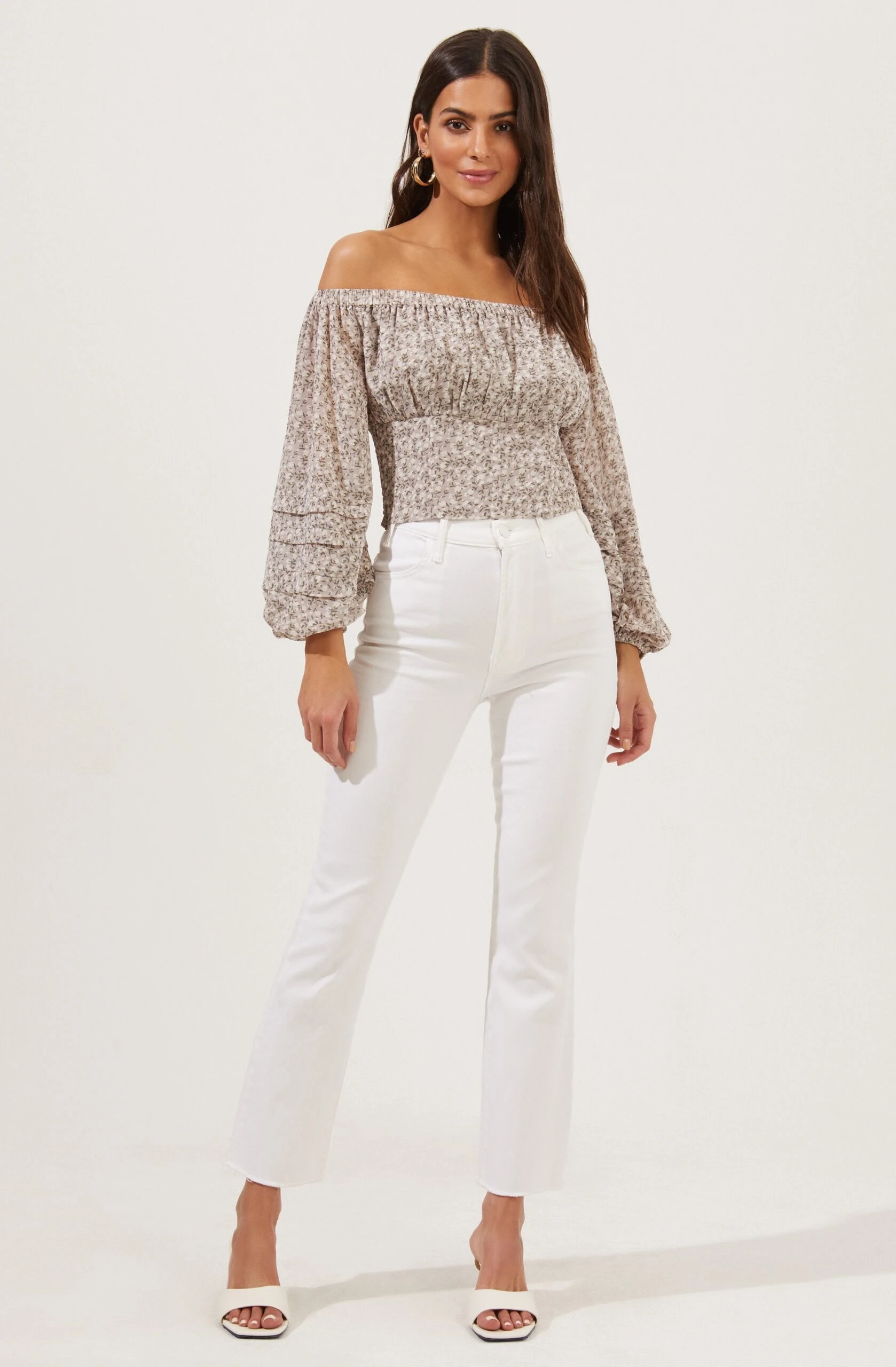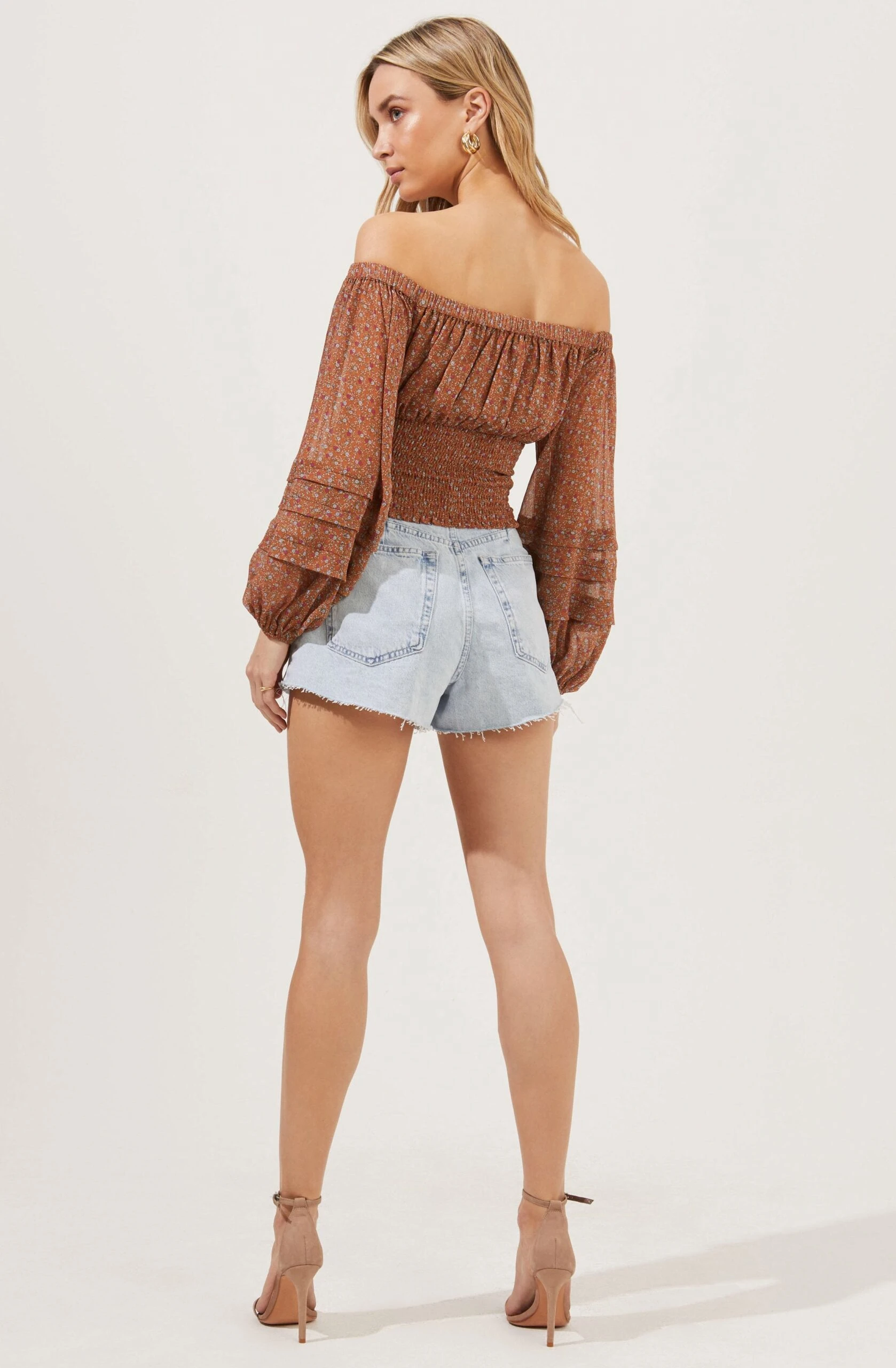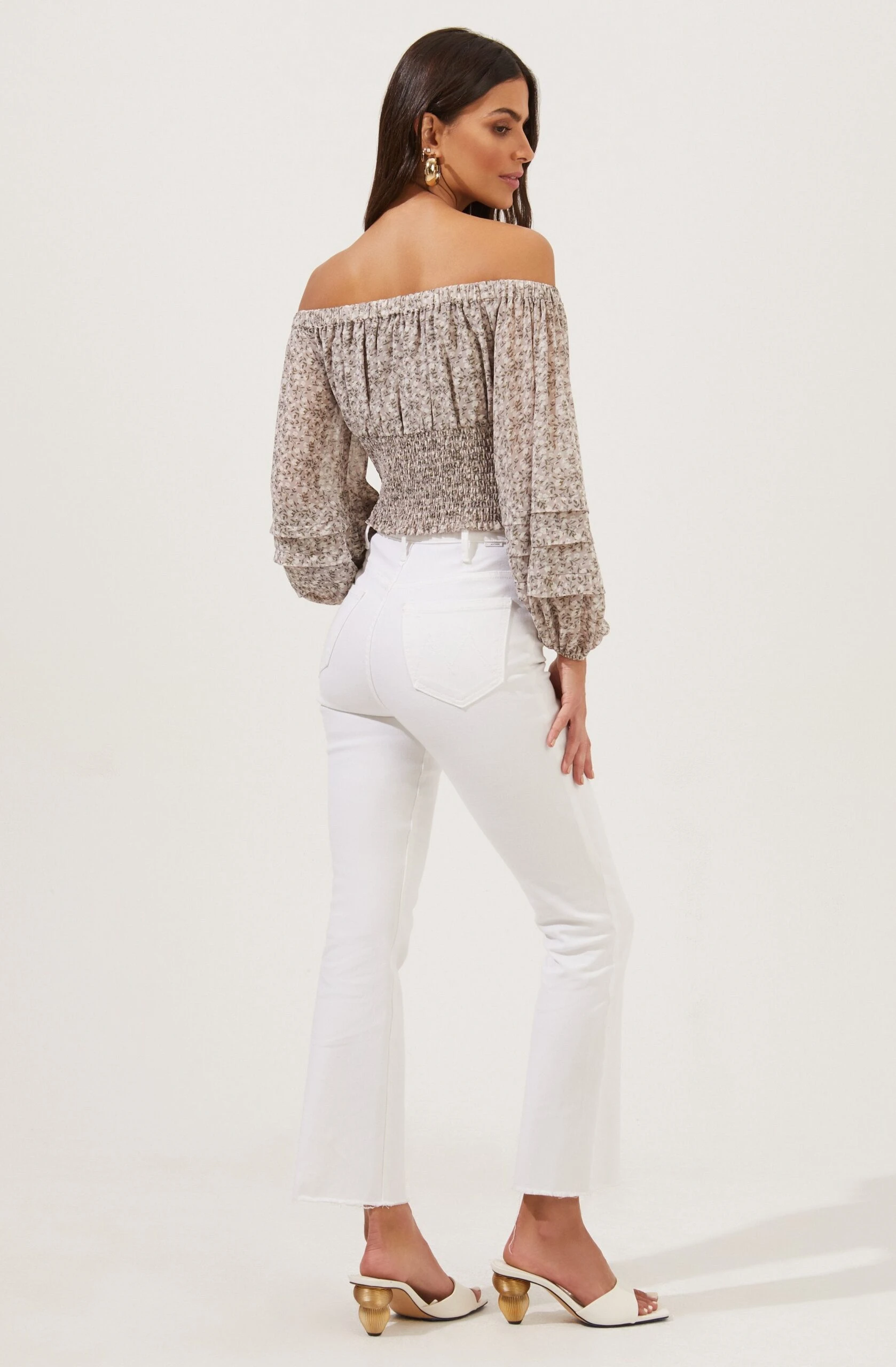 This stylish top features an off-shoulder neckline that leads to a gathered bust and fitted waist. Long tiered sleeves. Smocked back.