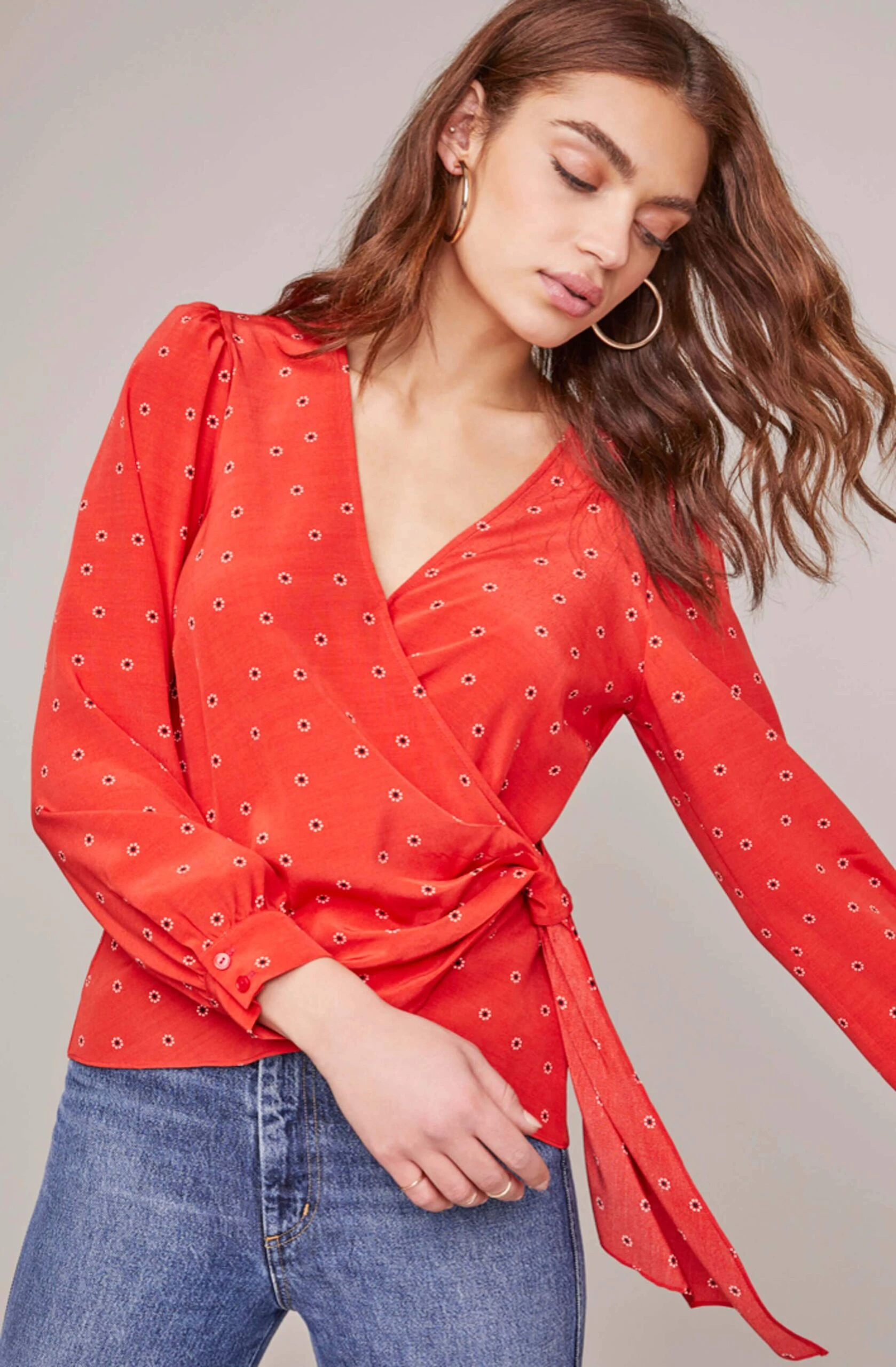 With a classic yet modern touch, this top pairs perfectly with your favorite pair of jeans! This effortless style features a V neckline that descends to a wrap front and side tie accent. Long cuffed sleeves. Statement dot print throughout.