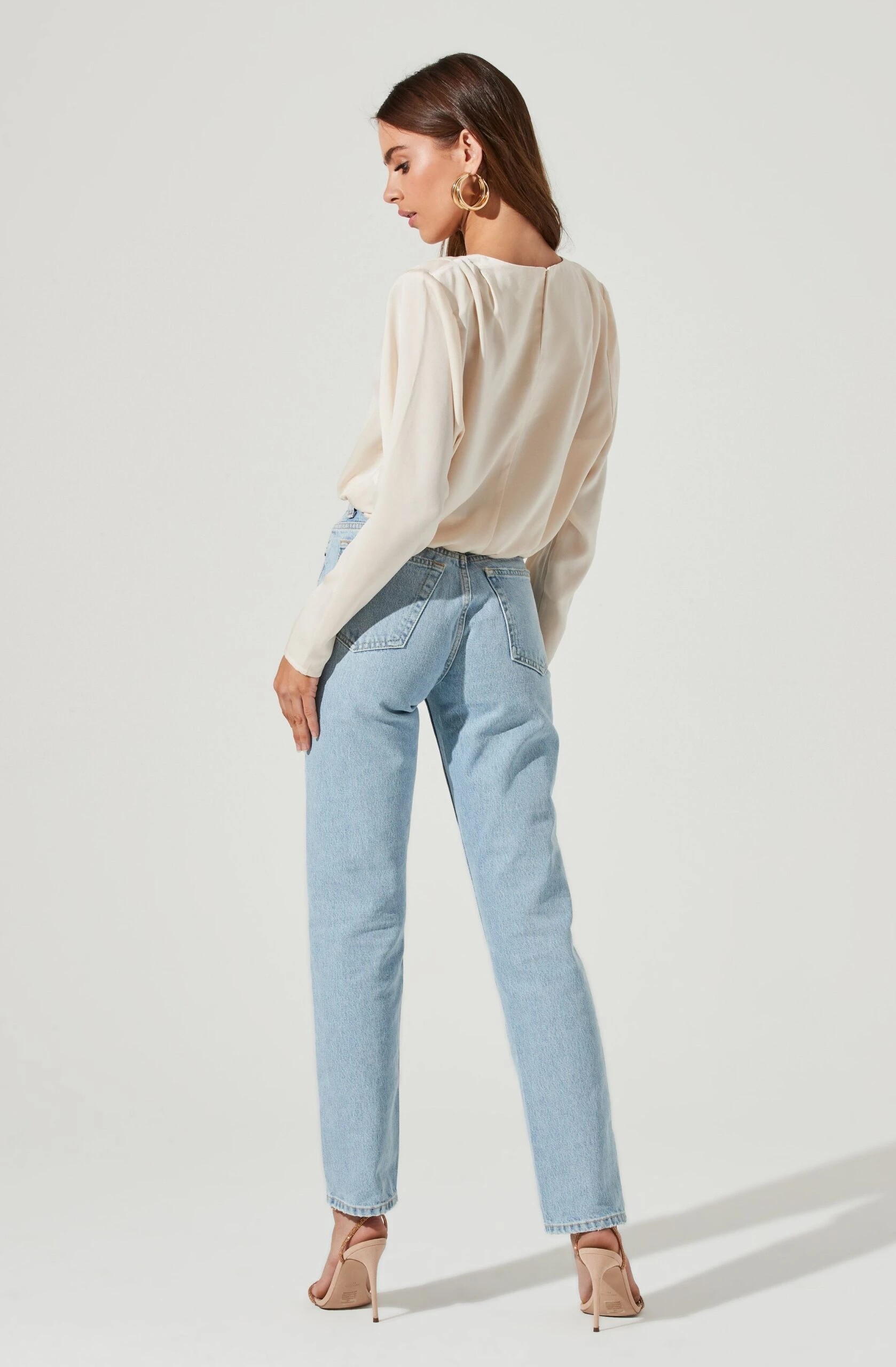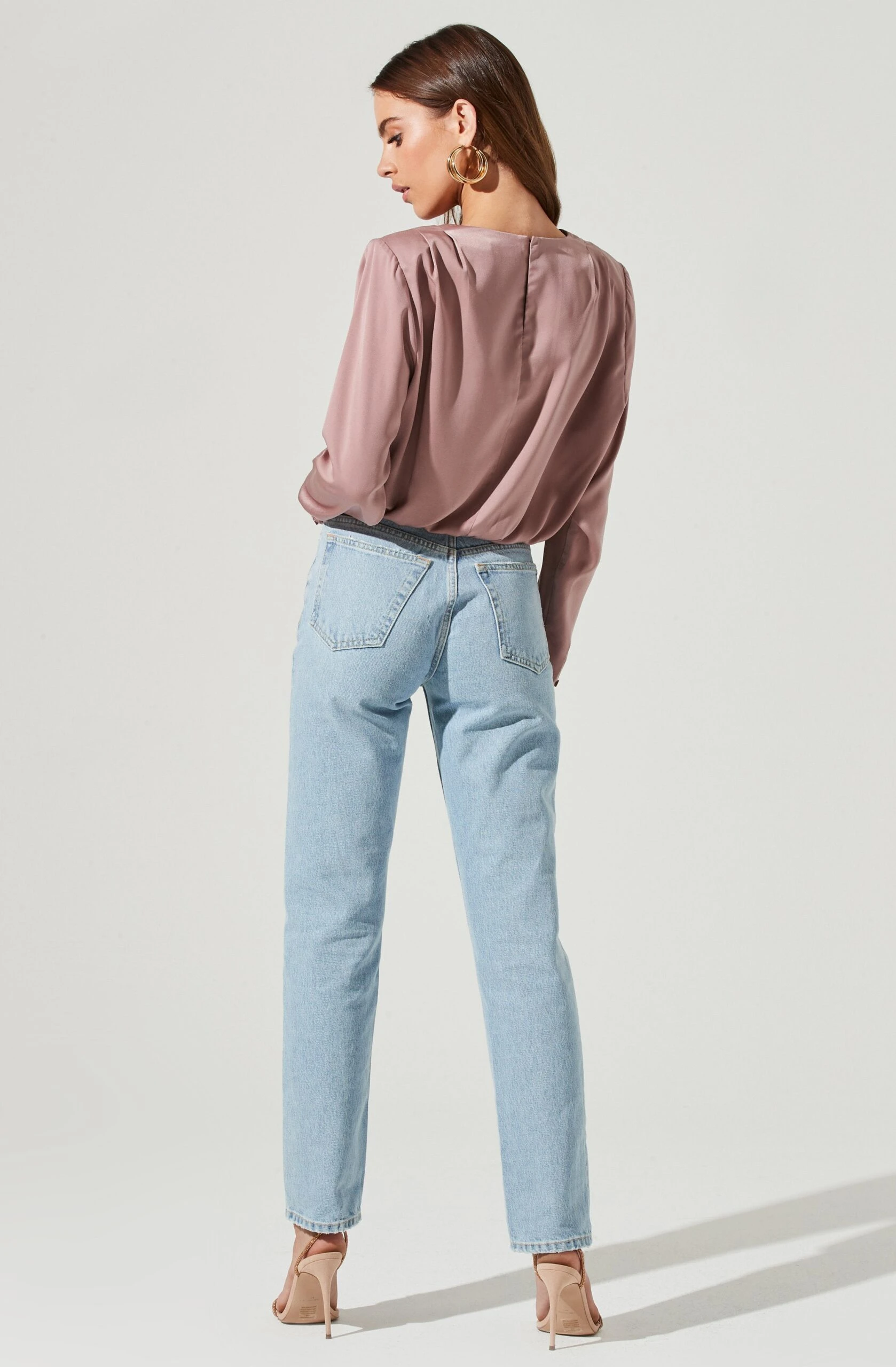 Take this satin look to the next level. It features a pleated shoulder design with a slightly oversized fit and long sleeves. Keyhole back.