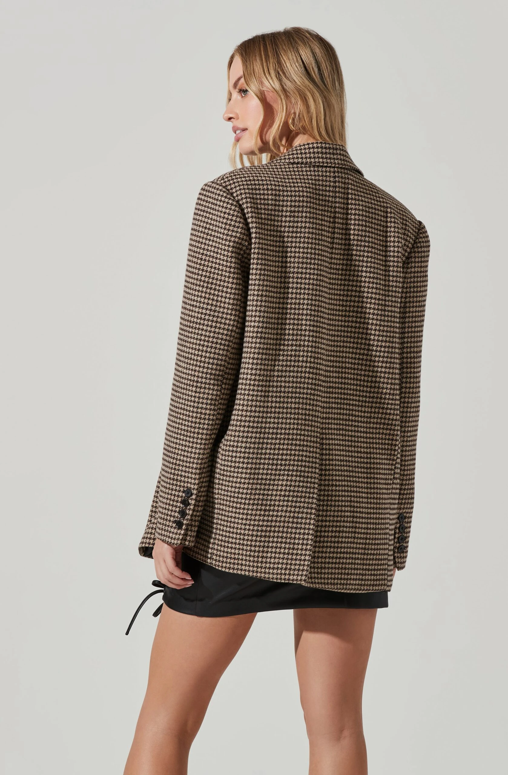 The Rachel Blazer features a statement houndstooth print throughout. Padded shoulders lead to a notched lapel and buttoned front. Long sleeves. Vented back.