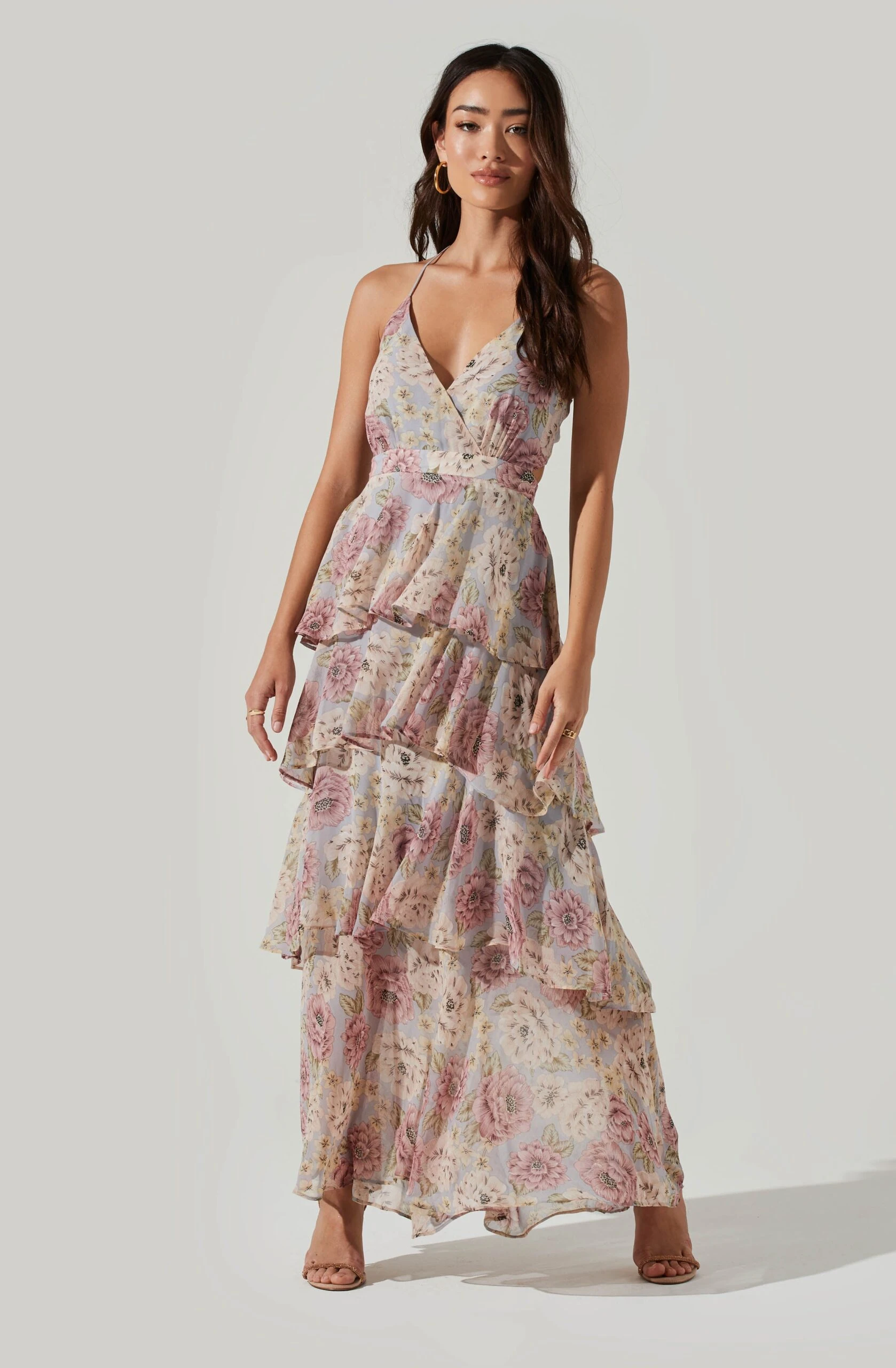 The statement dress of the season is here. This maxi dress features a plunge neckline that leads to a wrapped front. Tiered maxi skirt. Cutout back with adjustable straps that tie at the back. Floral print.