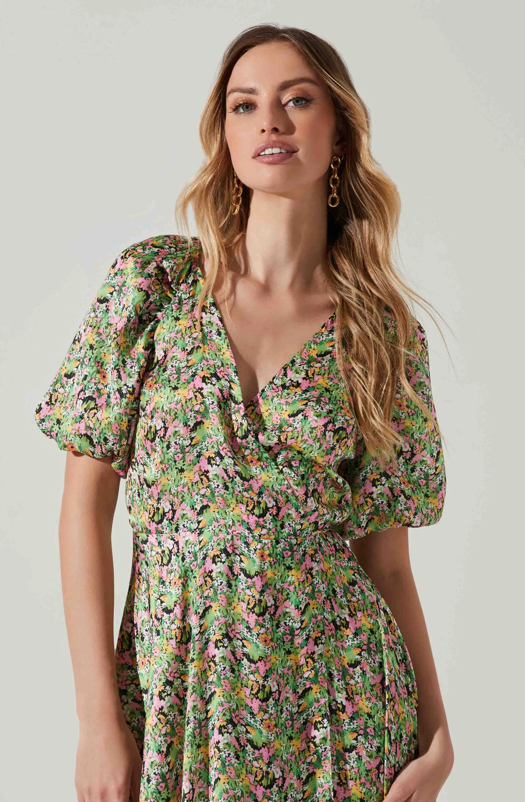 This occasion midi dress features an artsy floral print. Satin finish complements a V neckline that leads to a wrapped bodice that ties at the waist. Midi-length skirt. Short bubble sleeves.