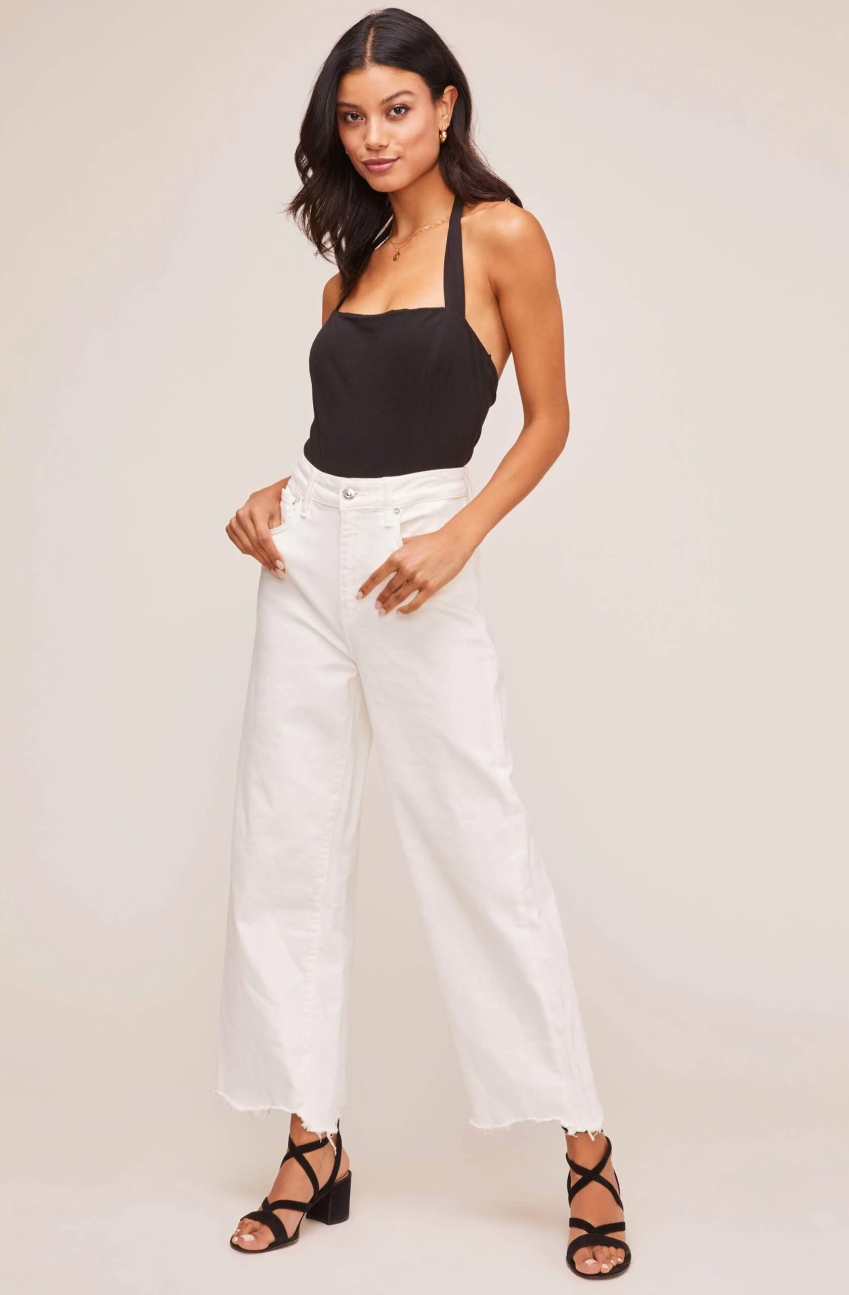 Vintage-inspired bodysuit starts with a square neckline supported by self-tie halter straps. Darted bodice that accentuates the silhouette and low-cut back. Smocked detailing.