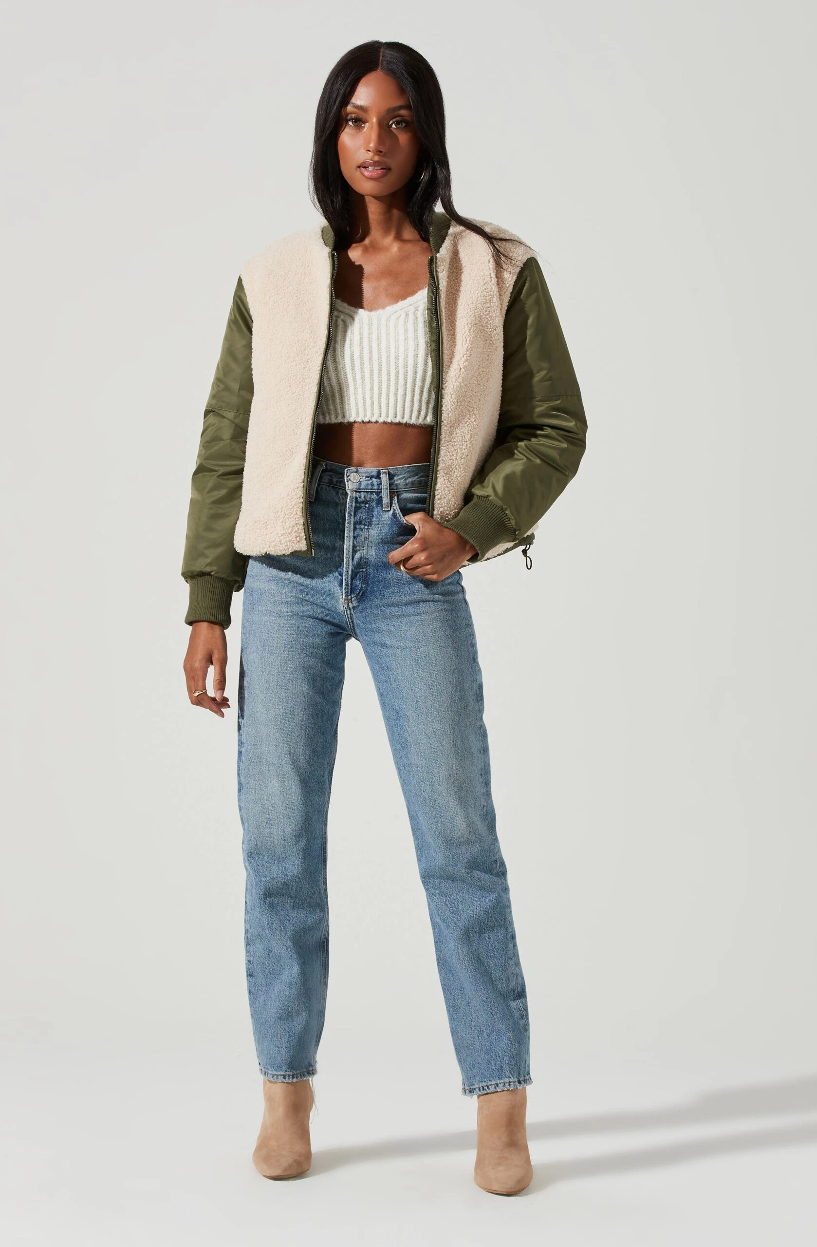 The Tegan Jacket features a faux shearling bodice with contrast puffer sleeves and ribbed knit cuffs. Zippered front. Slanted side pockets.