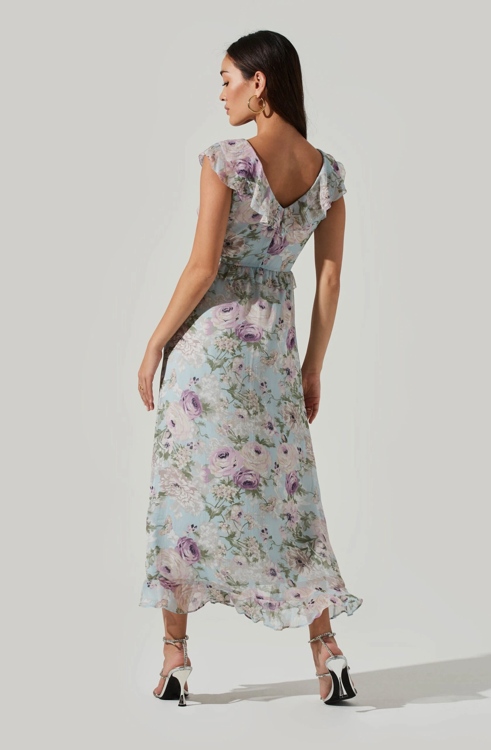 It’s all about making a statement. This midi dress features a V neckline with a delicate ruffle trim alone the neck and back. Fitted bodice features a ruffle trim accent along the waist. Midi skirt features a front slit accent with ruffle trim throughout. V cut back.