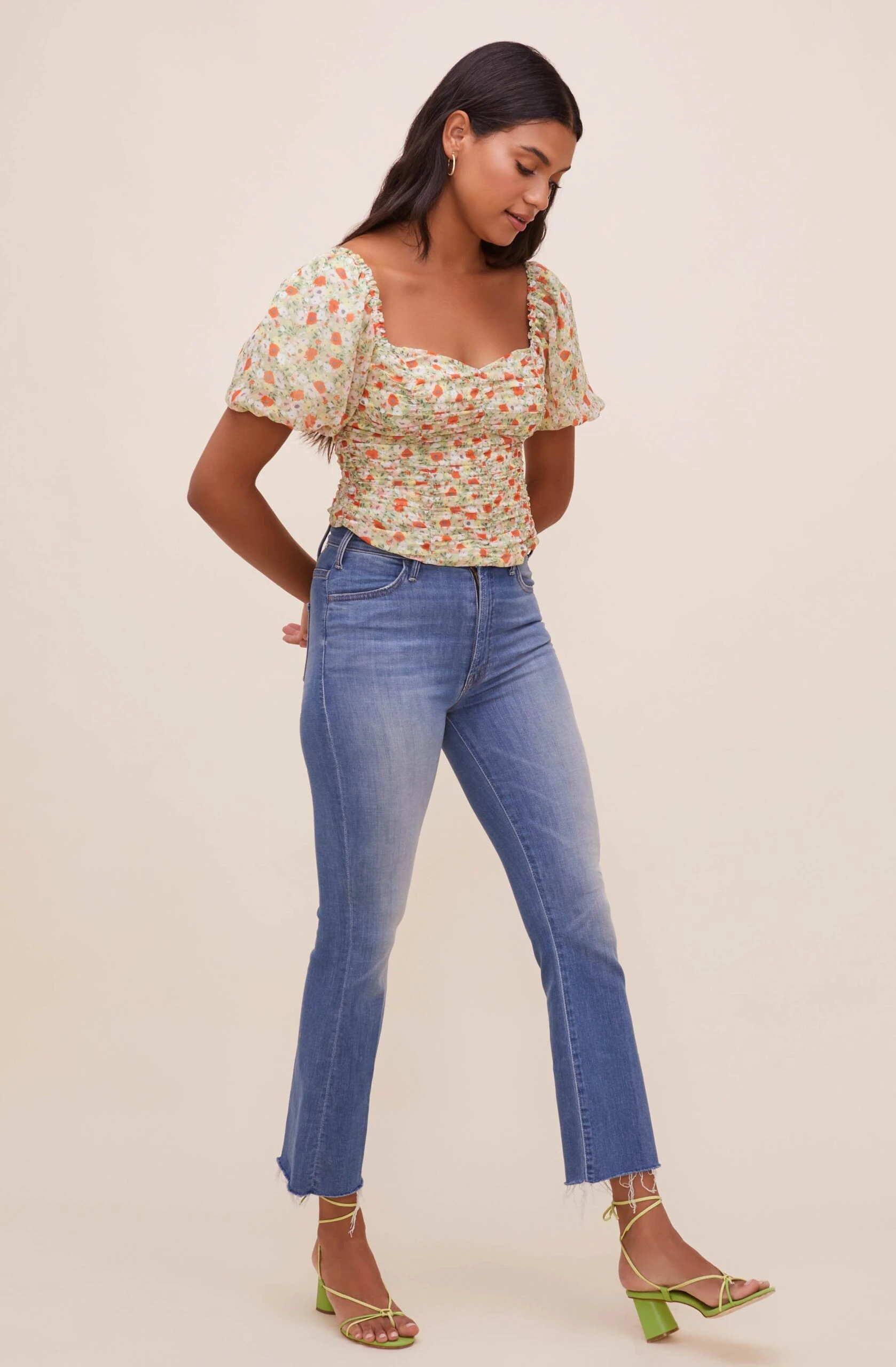 The Tenley Top features a sweetheart neckline that leads to a ruched front. Short puff sleeves. Dainty floral print throughout.