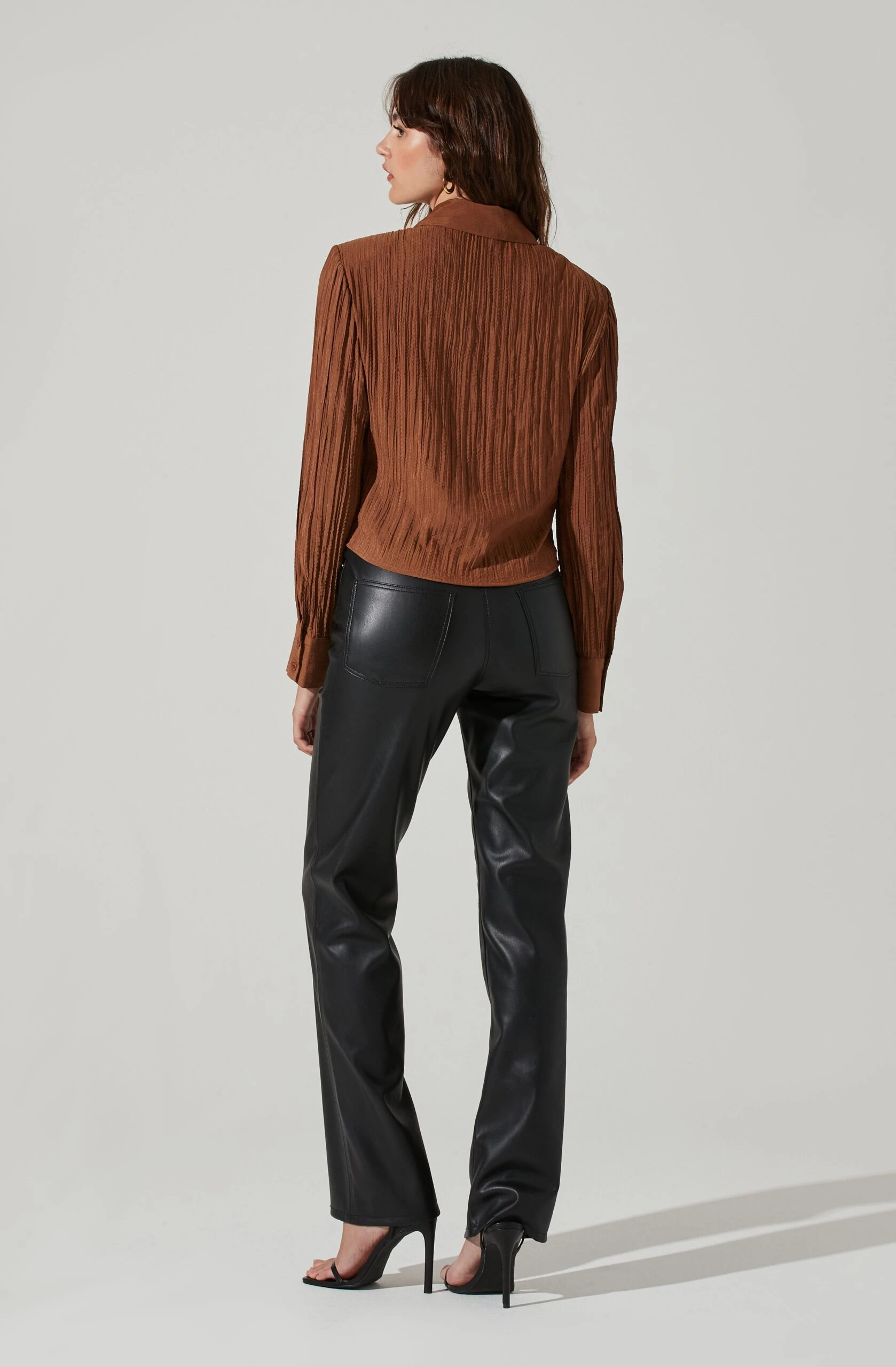 This chic top features a textured finish. Pointed collar leads to a ruched front and front button placket. Padded shoulders. Buttoned cuffs.
