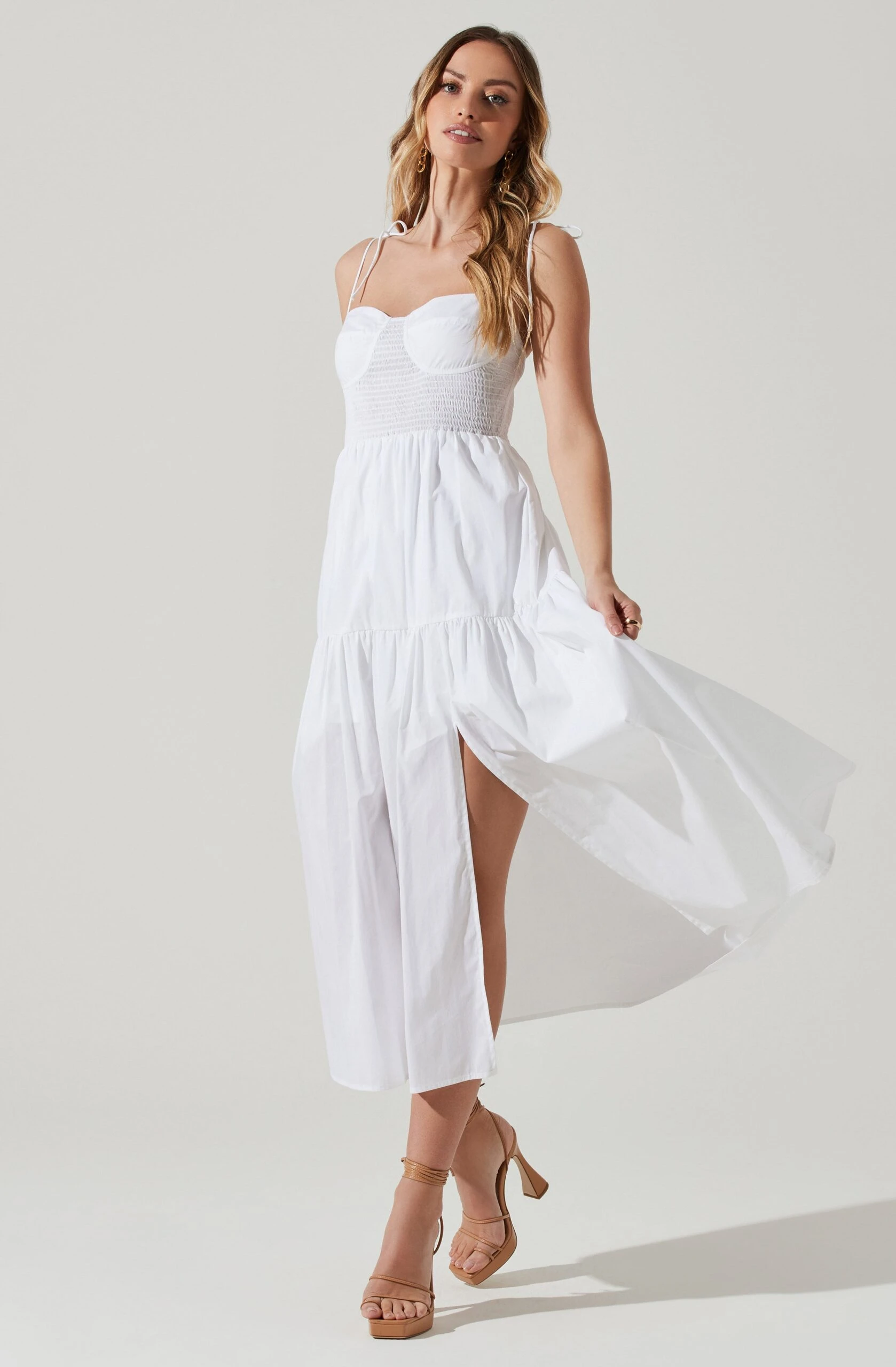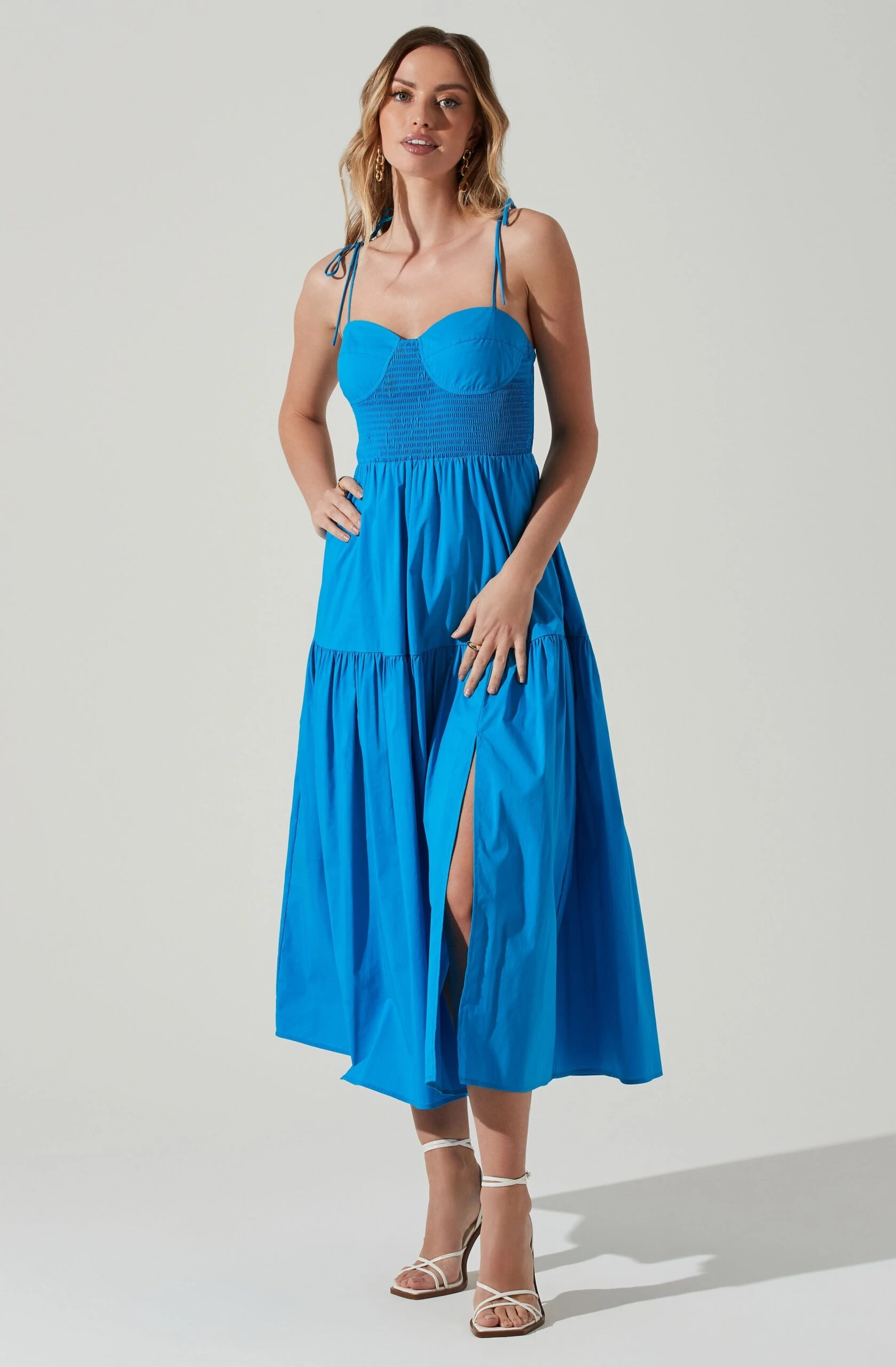 This midi dress features a sweetheart neckline that leads to a cupped bust and smocked bodice. Tie waist straps are adjustable. Tiered midi skirt features a side slit accent.