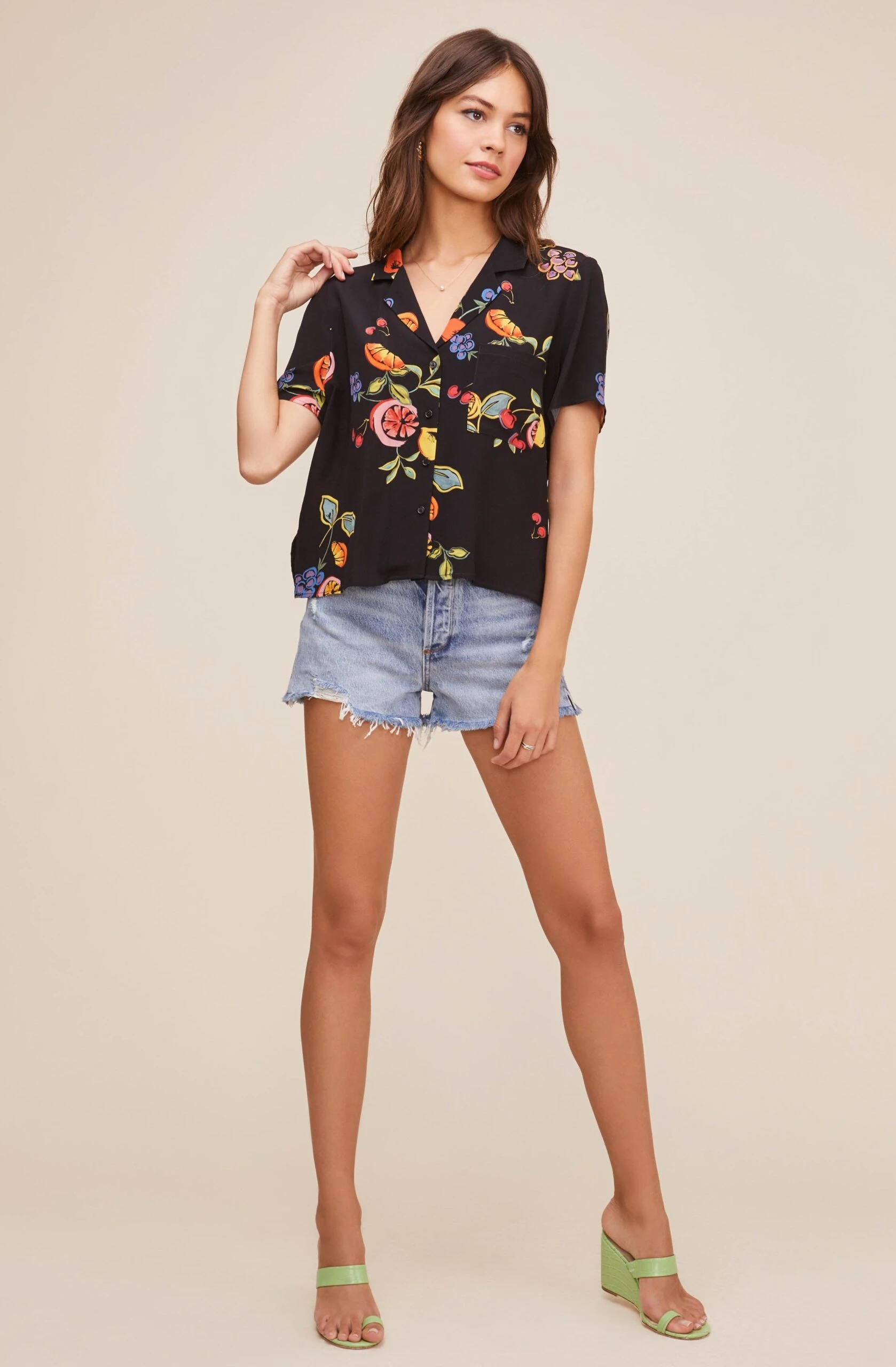 Be a tourist in your own city for a day! This cheerful top features a notched collar that leads to a button down front. Vibrant fruit print and short sleeves.