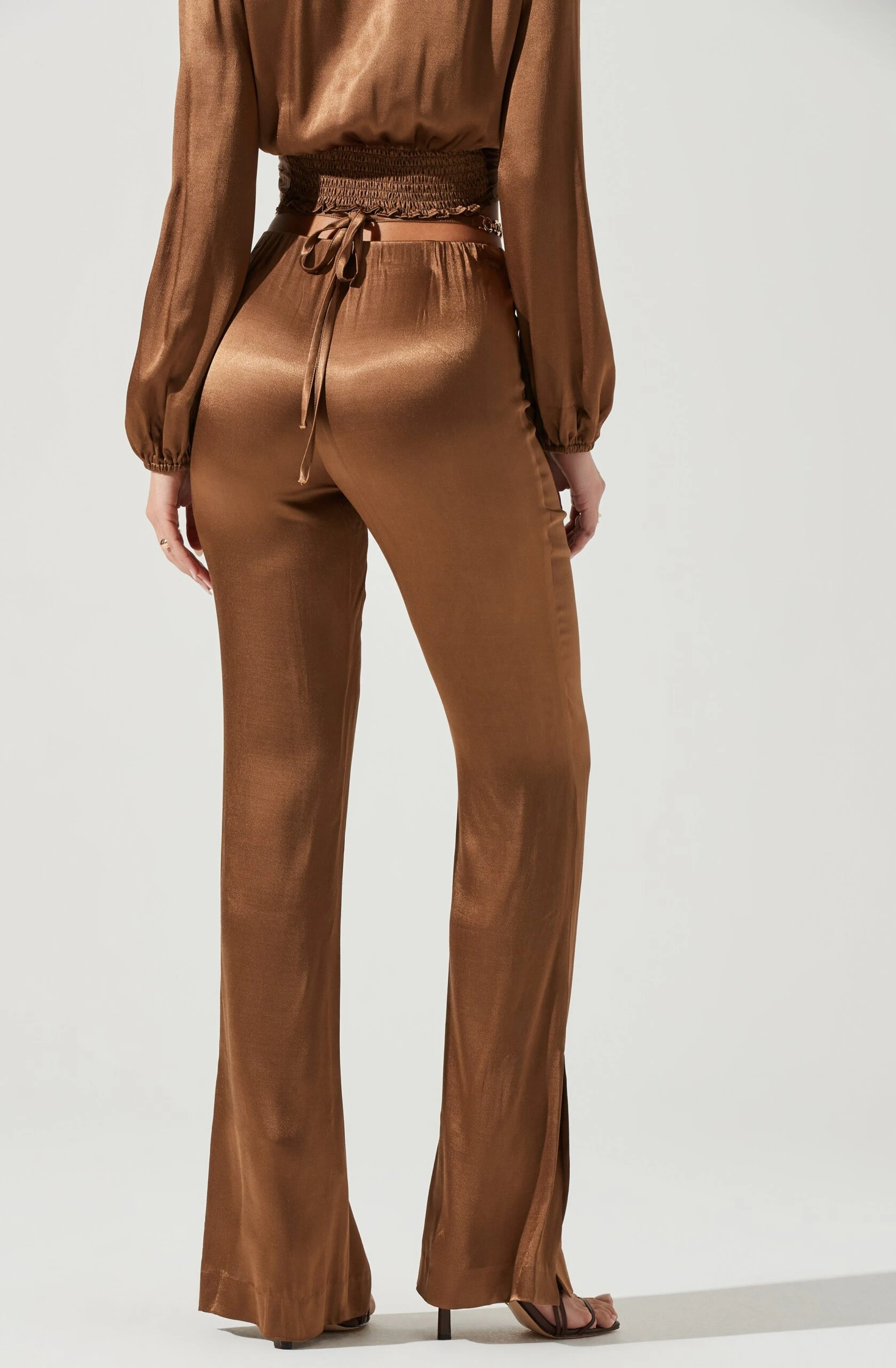 The Veira Pants features a satin finish. High rise waist features a chic tie waist detail. Flare leg bottoms with side slit accents.