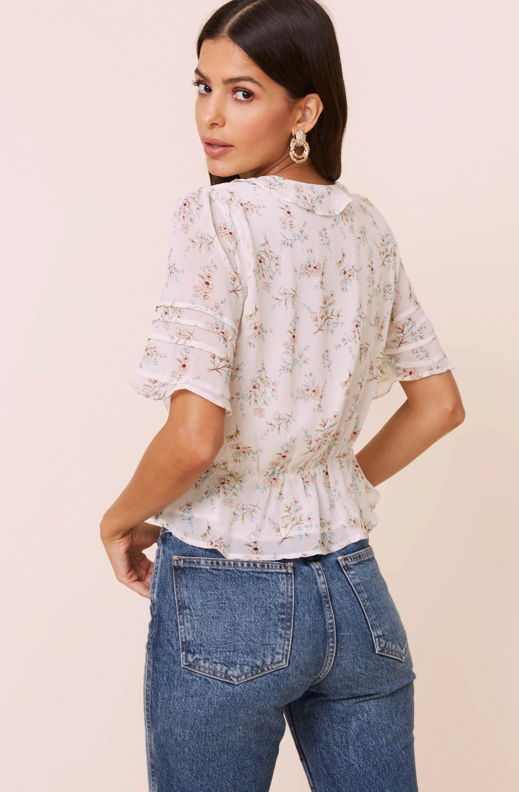 Keep it sweet in this summer-ready top. It features a ruffle trimmed V neckline that descends to a wrapped front. Delicate floral print throughout. Short sheer sleeves.
